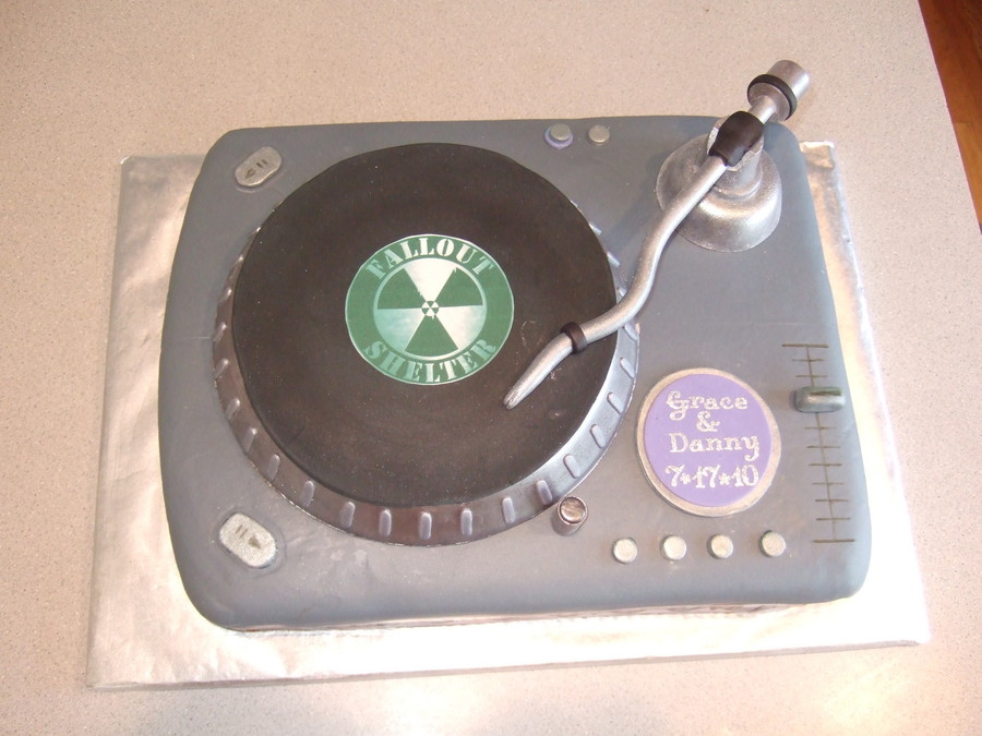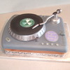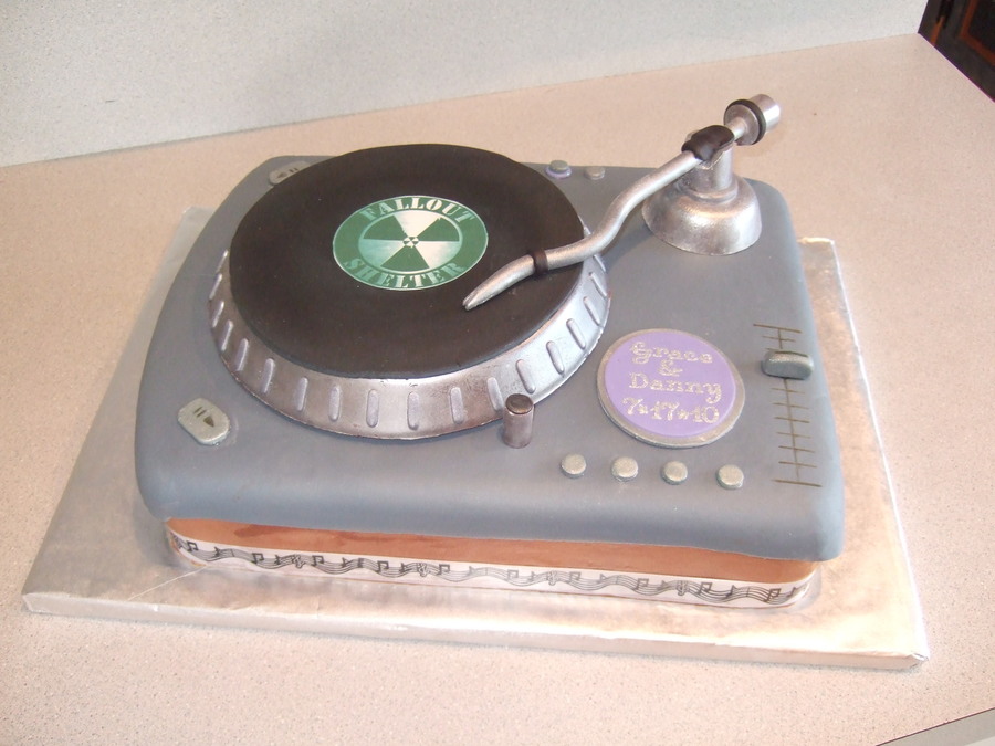 This was a grooms cake. The groom is a DJ and I copied his turntable. Mostly fondant with a gumpaste arm. The part under the record is made of rice krispy treats covered in chocolate.