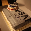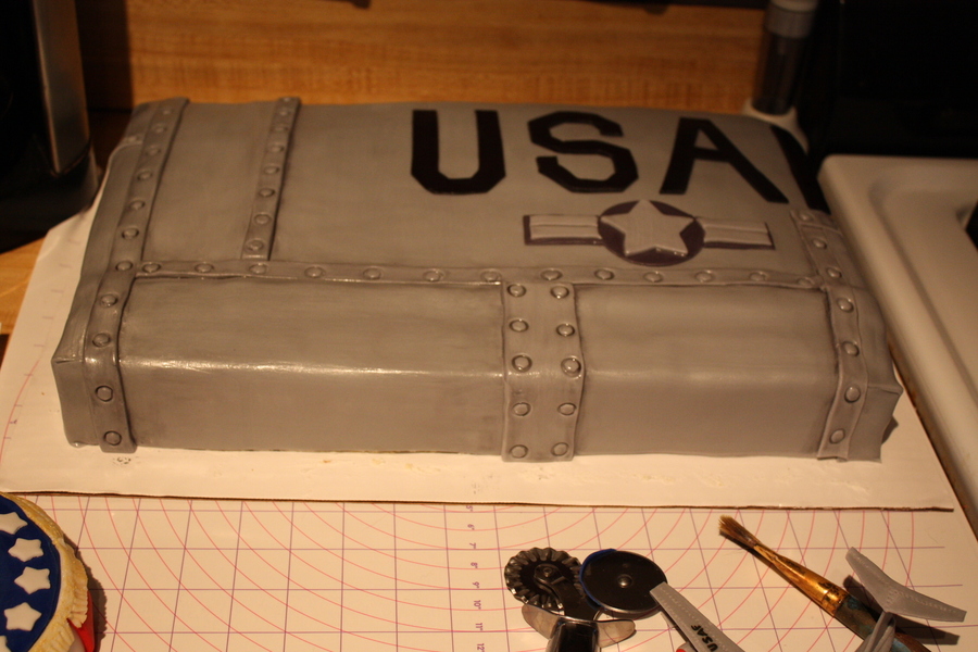 Chocolate cake covered in fondant. Airplane also sculpted of fondant, cant recall the model but it was the plane the recipient flew in the military, to scale.