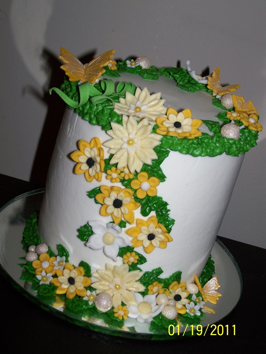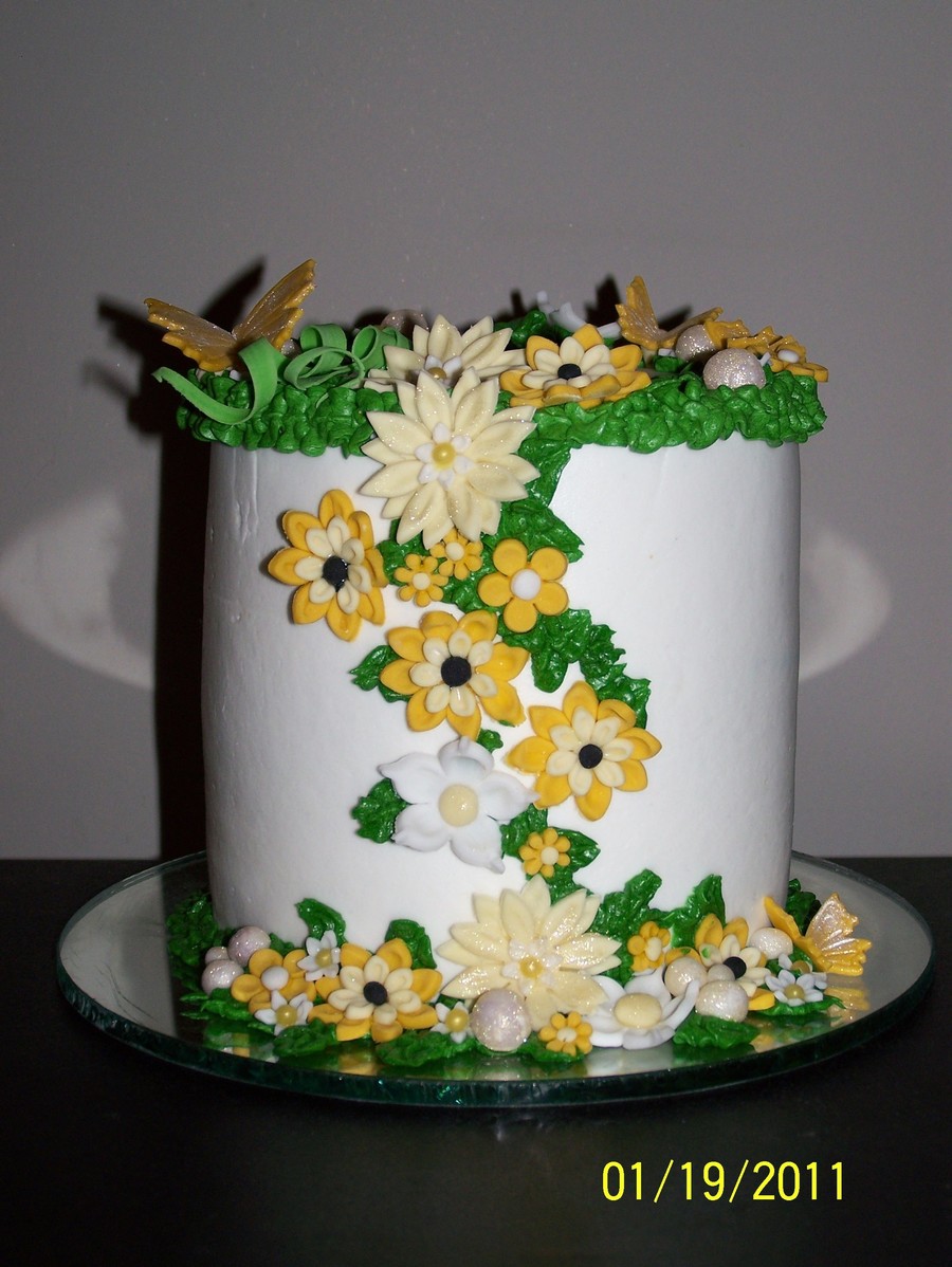 5" round for our ladies get together. I LOVE this cake! It was my first cake that I was completely (ok, almost) happy with. It felt like my "It's about damn time!" cake. It's a knock-off of a beautiful pink and white cake by Suzisweet. My first no bulge cake! There are some reflections from the mirror at the bottom of the cake on both sides of the decorating. Please feel free to critic, I'm happy to learn more. TFL!