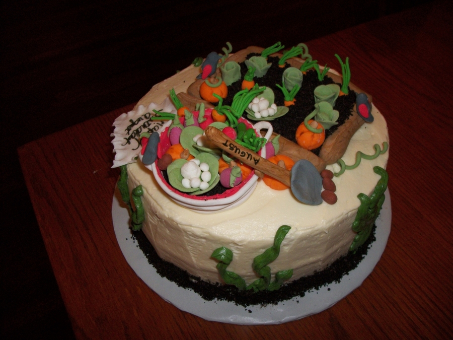 Everything is edible. My brother (his name is on the shovel) is an avid gardener. The soil is crushed oreos. It is a carrot cake with buttercream frosting.