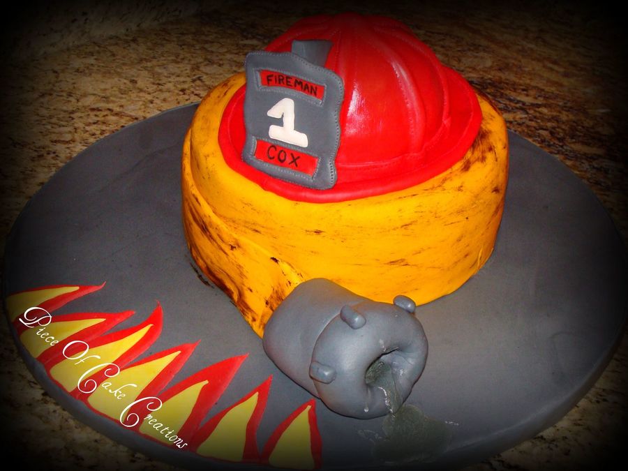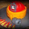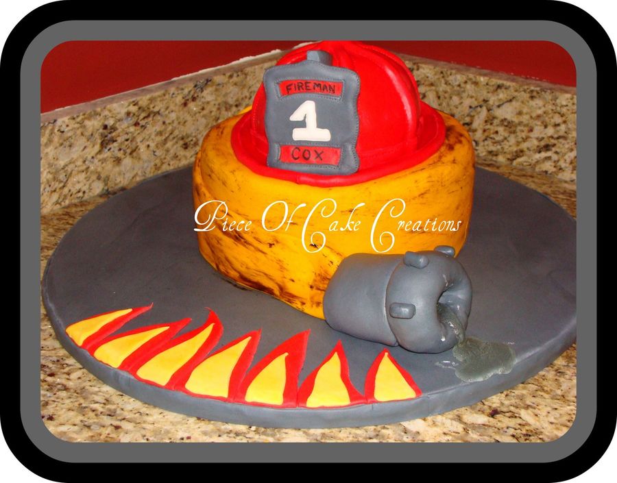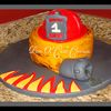 Carved cake for the helmet. 8 inch cake for bottom. Made for a Fireman's Graduation. The water is made out of sugar.
