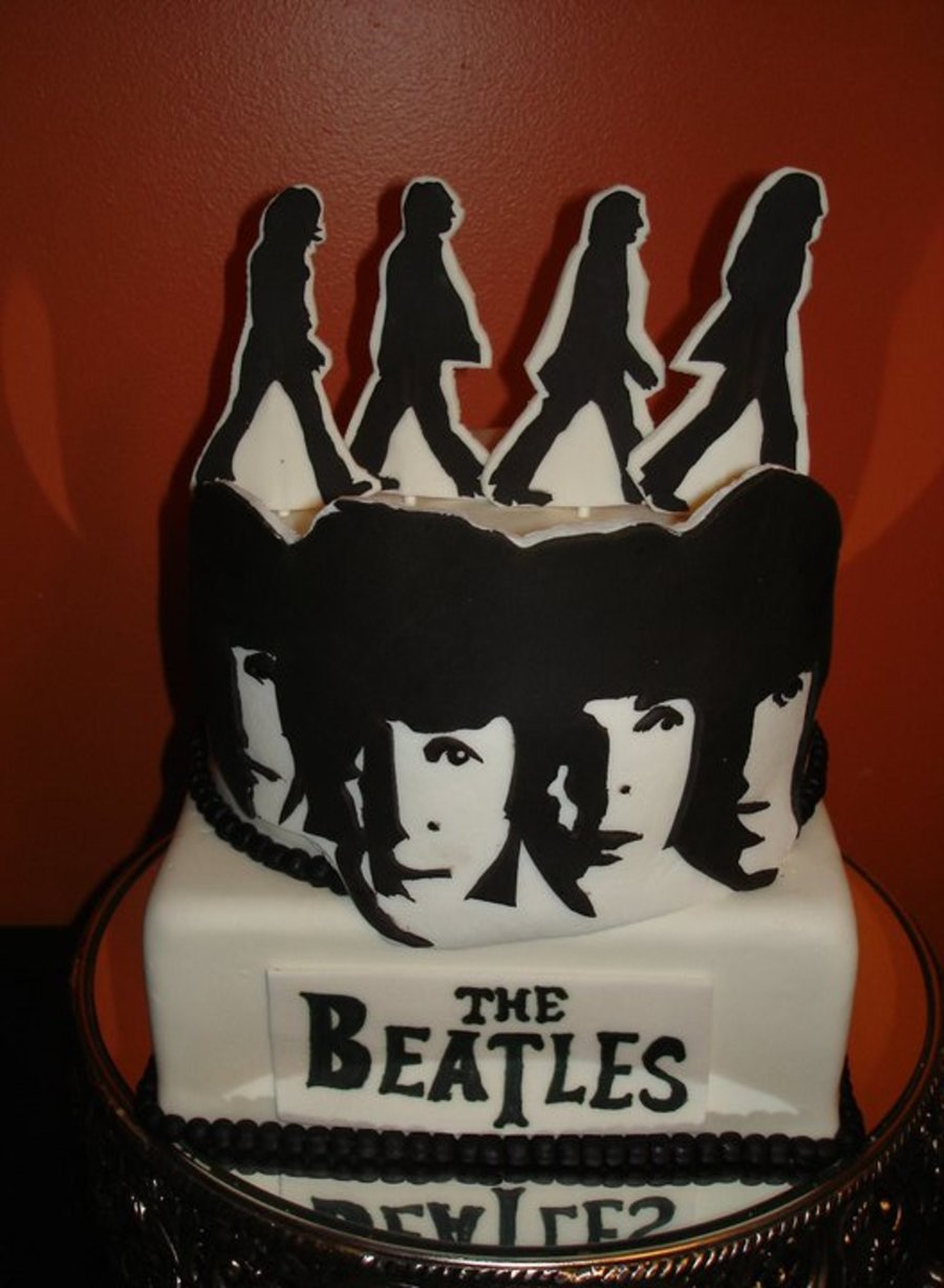 Gumpast characters on top with black and white sillouettes of the Beatles