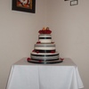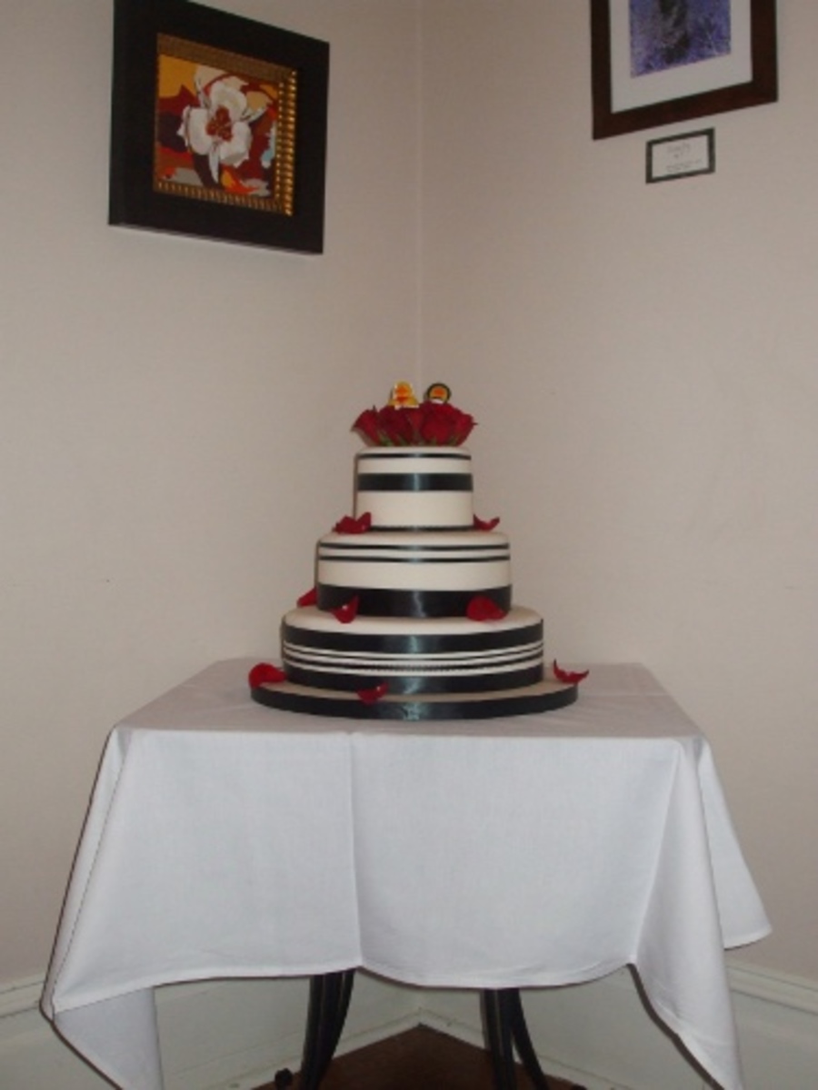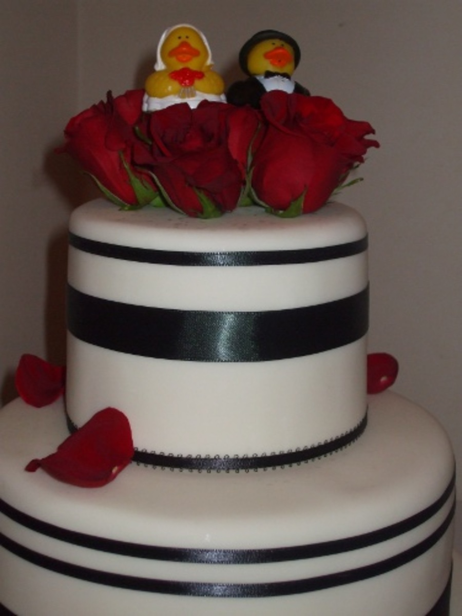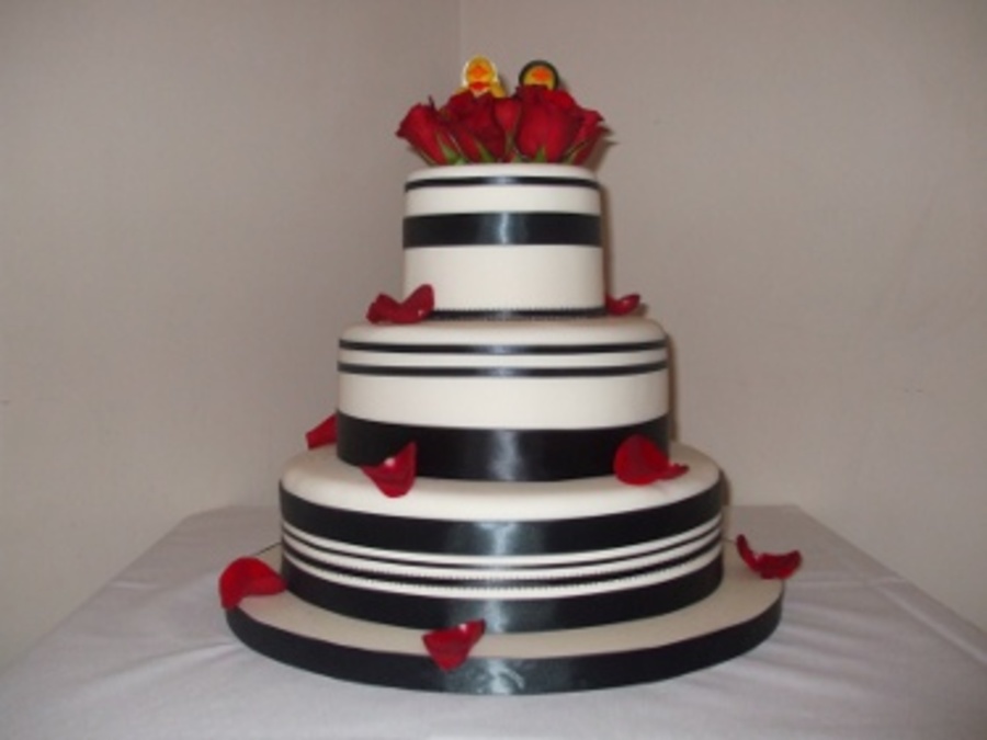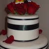 Danielle's cake features white fondant with an art deco look created by varied sizes of ribbon and beautiful fresh roses. It's one of my favorite contrasts: red and black on white. The bottom tier is vanilla cake with milk chocolate ganache, the middle tier is eggnog cake with vanilla buttercream, and the top tier is chocolate cake with creamy coconut filling.