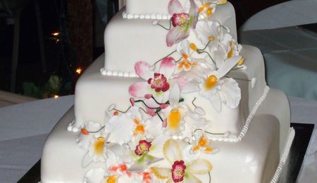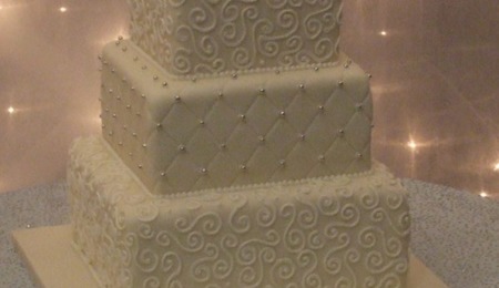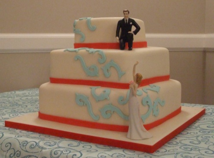 Hailey's cake was a fun art deco cake featuring white fondant icing with Sea Kiss scrolls and Autumn Fire fondant ribbons around the base of each layer. The bottom tier was vanilla cake with milk chocolate ganache, the middle was chocolate cake with strawberry filling, and the top tier was Oreo cookie cake with Oreo cream cheese filling.