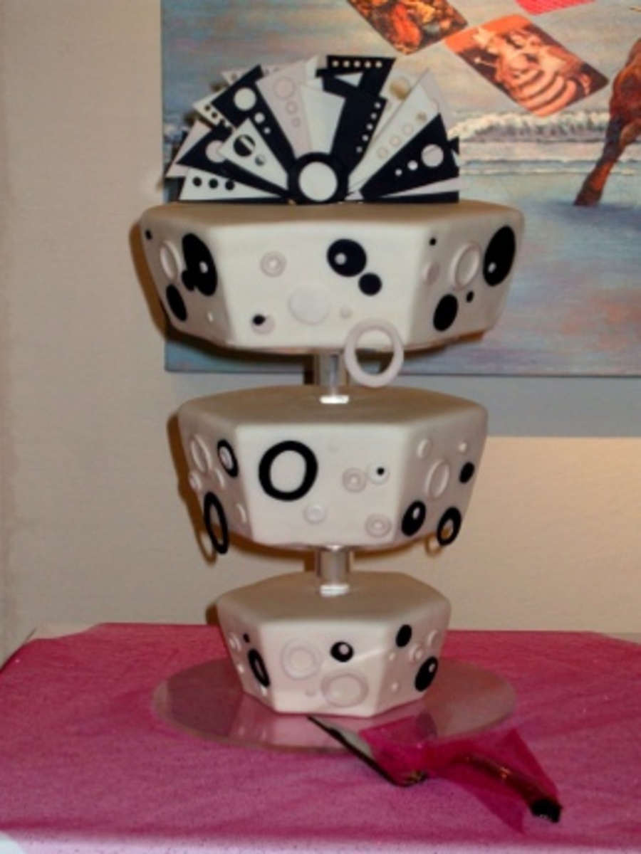 This art deco cake was chosen by a wonderful bride for a fitting venue: It was a local art gallery. The geometric design of this cake created sharp lines and artistic symetry. The bottom layer was coconut with creamy coconut filling, the middle layer was tuxedo cake which is double chocolate chip cake with white chocolate truffle filling, and the top layer was raspberry lemonade cake with both raspberry and lemon buttercream fillings. The bride and groom were so excited to try all three flavors.