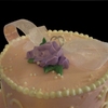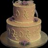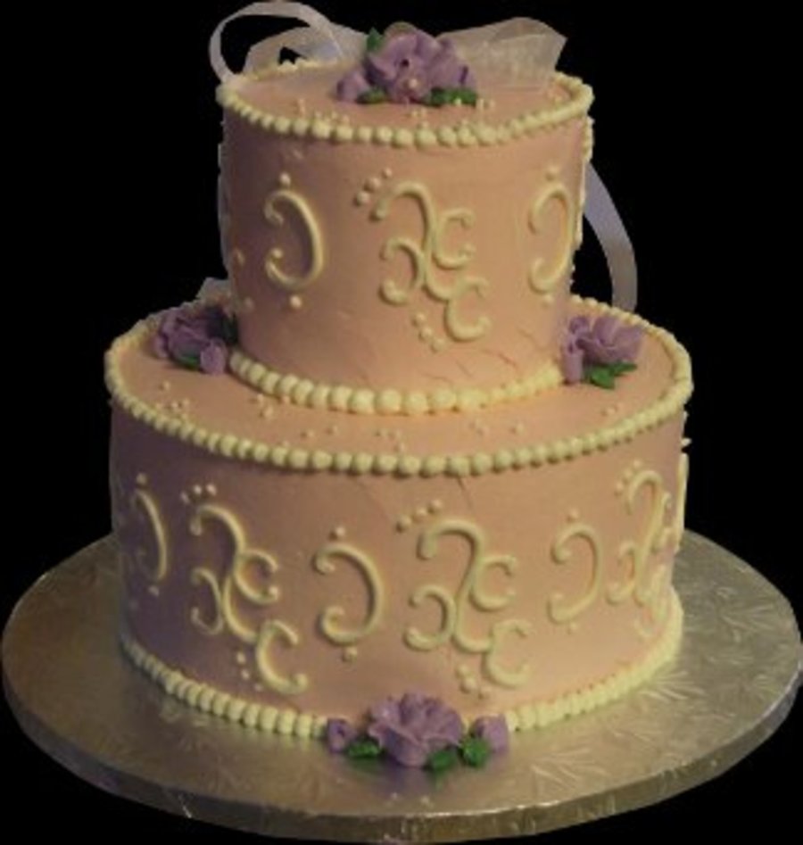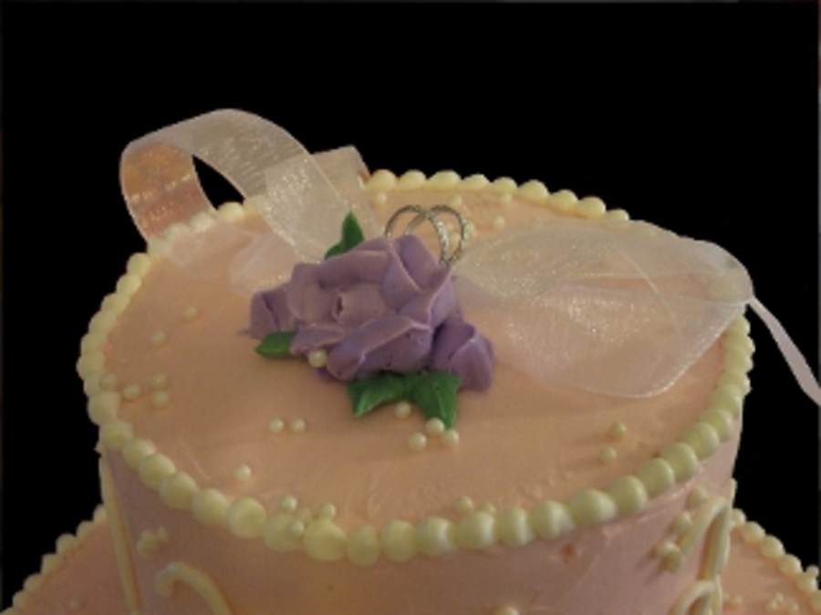 This buttercream bridal shower cake is chocolate on the bottom tier with custard filling and vanilla on the top tier with raspberry filling. The cake is decorated with buttercream roses, sugar pearls, and two silver wedding band favor accent rings.