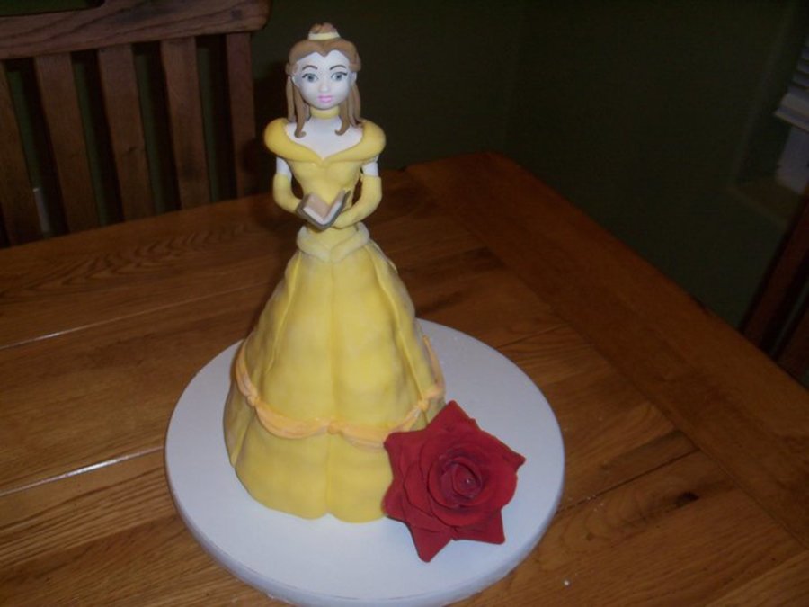 My daughter's 3rd birthday cake, Belle. Ill be the first one to say it, get that girl a big mac and a sun tan. She was extreemly difficult, everything is edible minus the dowel down the middle and the little foam bit inside the bud of the rose. White chocolate cake, cheese cake filling, raspberry filling. I think there are 6 layers on her dress. Belle is holding a book. If anyone has any tips on white coloring (icing whitener) for the eyes I would love it. The highlight kept bleeding into the black. It was very unfortunate.