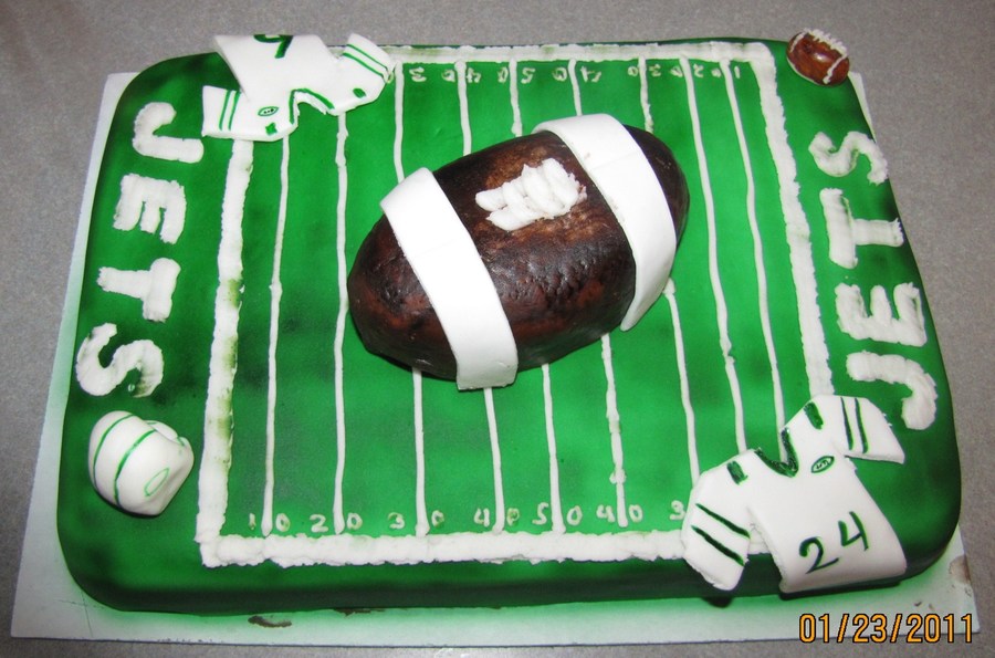 Jets cake for playoff game:) Simple 1/4 sheet chocolate with choc buttercreme and MMF. Football is rice crispies covered in MMF. All other pieces MMF. TFL.