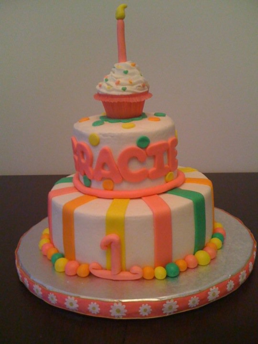 Bottom tier and cupcake is strawberry flavored. Middle layer is yellow cake. All buttercream with MMF accents. We used the cupcake as the smash cake for the birthday girl. Thanks to other CCers for the inspiration.