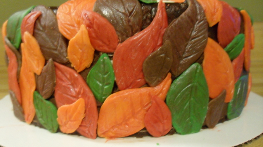 Chocolate ganache cake covered with modeling chocolate leaves