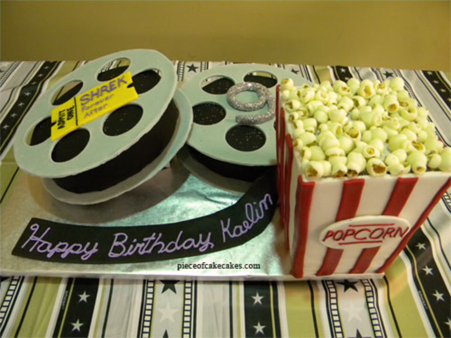 the cake was the popcorn container and the inside of the movie reel. reels were gumpaste. popcorn was fondant.