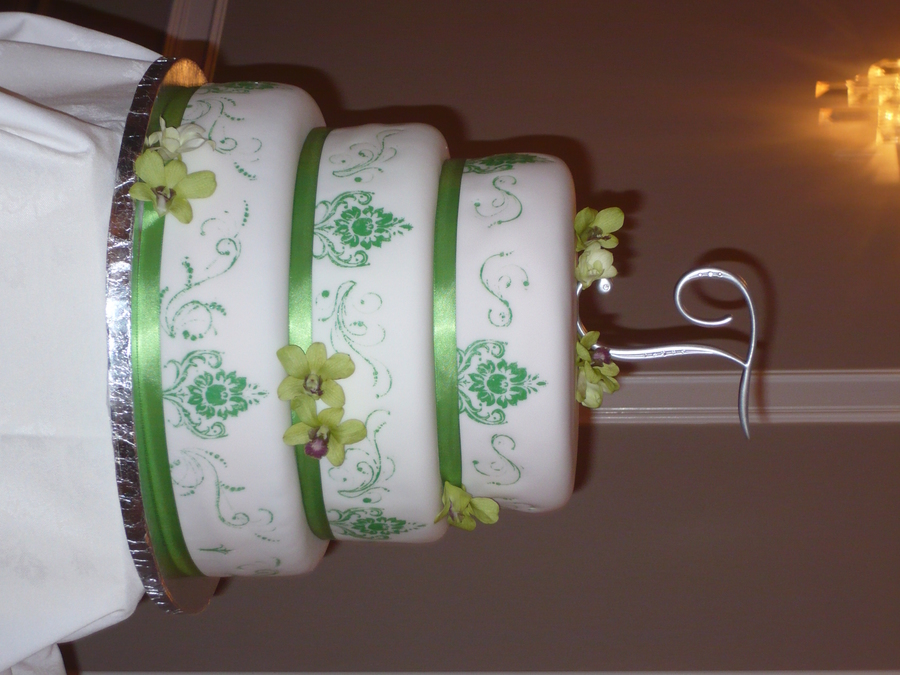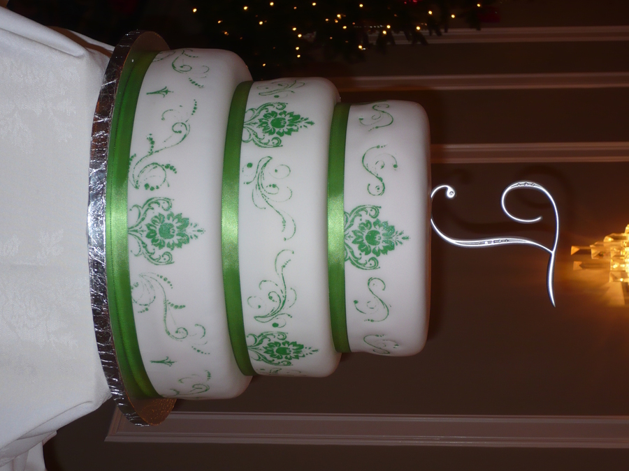 A classic round wedding cake made for a friend, and tiers are 10, 12, and 14. All of the cake was scratch vanilla, and then the 12 had vanilla buttercream, and the 10 and 14 were raspberry buttercream. Designs were stamped on in a bright green to match their cheerful colour.