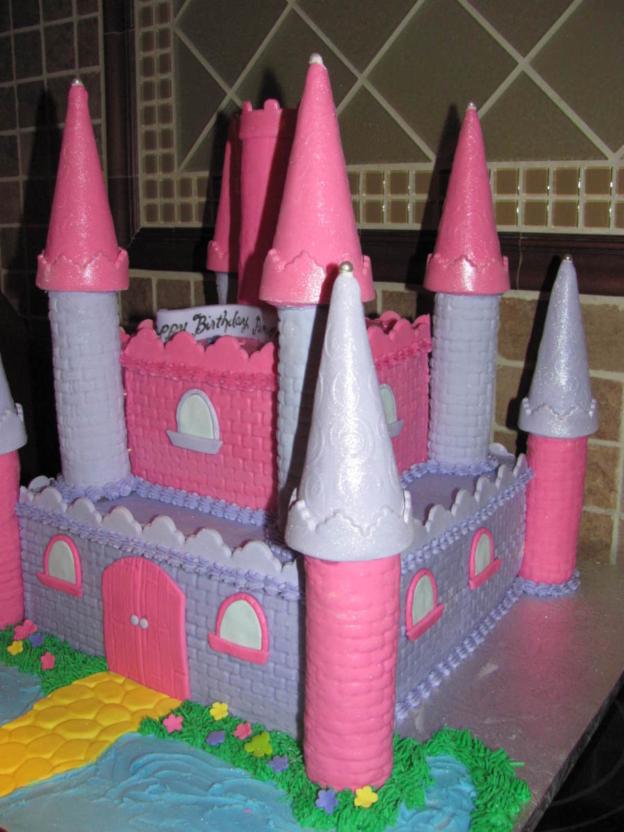 First time making a castle cake. took a lot of time but happy w/ the way it turned out. Iced in buttercream w/ fondant decos. sugar cones for towers covered in fondant turrets are RKT covered in fondant. used brick impression mat. used straight frill cutters for trim on each tier.