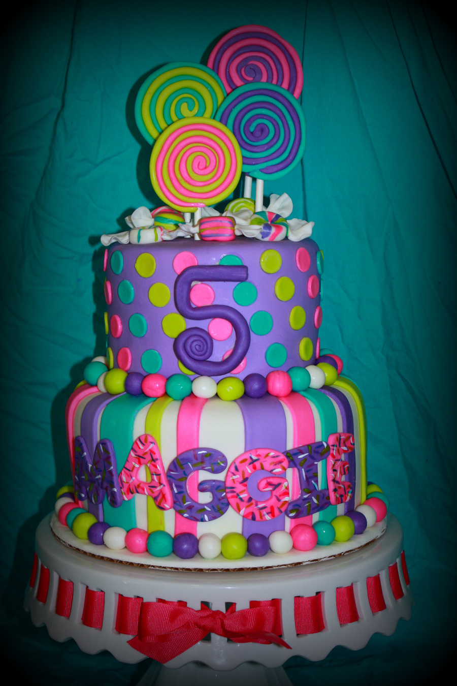 I made this cake for a little girl who's party was at a Lollipop Shop, so her mom wanted to go along with the candy theme. Its an 8 inch and 6 inch layer cake. All decorations are made from marshmallow fondant.