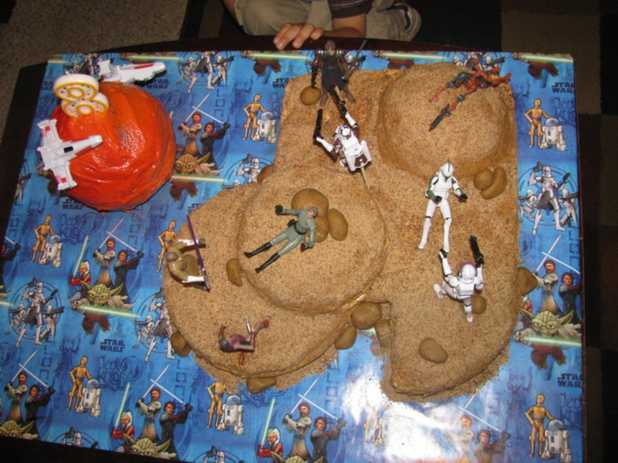 This is a Star Wars cake I made for a eight year old's Birthday. The cake is vanilla cake with almond frosting. Everything in hand carved cake and or fondant, excepted the toy figures. Thanks for looking :-)