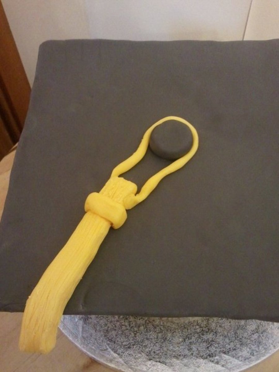 This is a pumpkin bread coated with cream cheese frosting and then covered with fondant to make the morterboard.