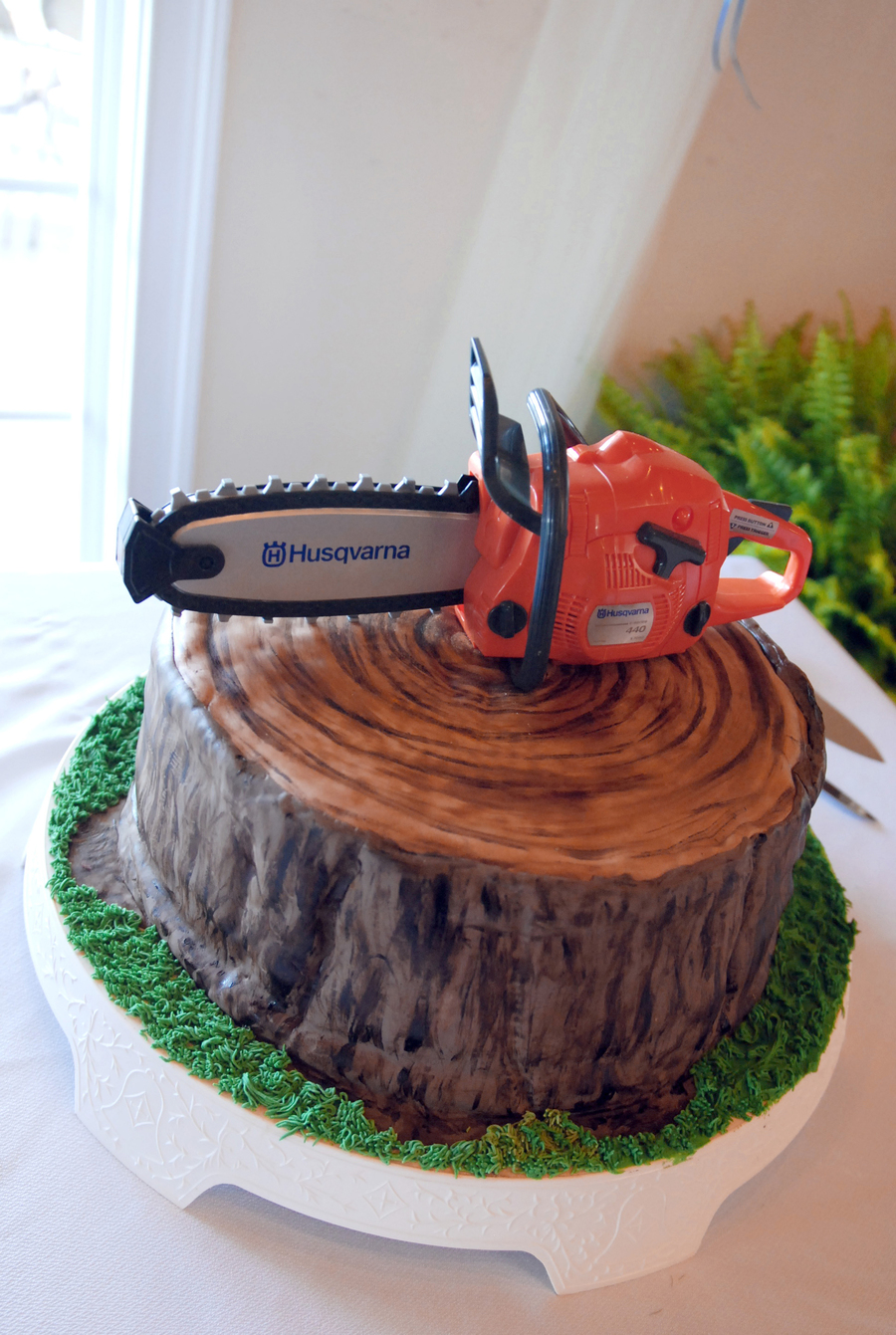 This was my husband's groom's cake. He helped with it along with my daughter. We had a good time making it. Chocolate cake with fondant covering the "stump". Buttercream grass. The chainsaw was a toy replica of company he works for.