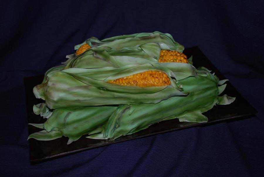 Individual ears of corn.... I mean cake. Each iced in yellow buttercream and covered with fondant kernals and husks. Airbrushed, hand-painted and dusted with color as necessary. Stacked on a platter and displayed as a centerpiece at a Corn Roast.....right up until dessert time!