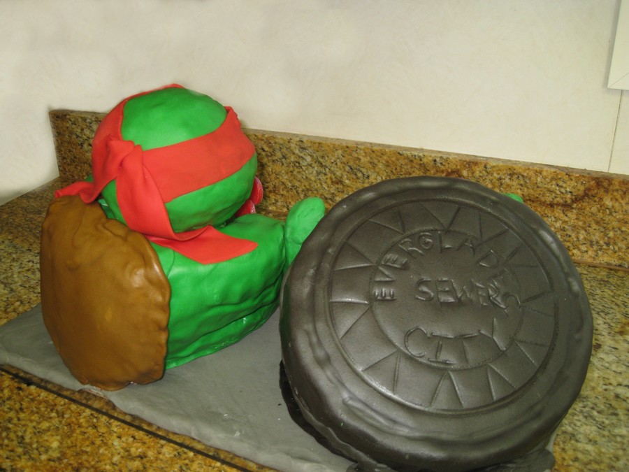 All cake except for arms of turtle in the sewer. Fondant covered red velvet and spice cake. My 27 year old daughter wanted something "Ed Hardyish" for her birthday cake, but I thought it might be too "cutting edge"(translation--scarey!) for grandma (who was also going to be there) so she settled for Ninja Turtles which she loved as a kid, instead of a skull with a hat on!!! Thank god for understanding daughters!!!!!