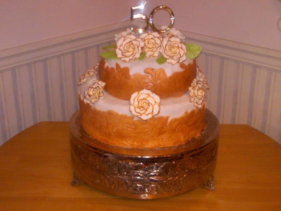 50th Birthday, fondant lace painted gold, flowers trimmed in gold lustre dust.