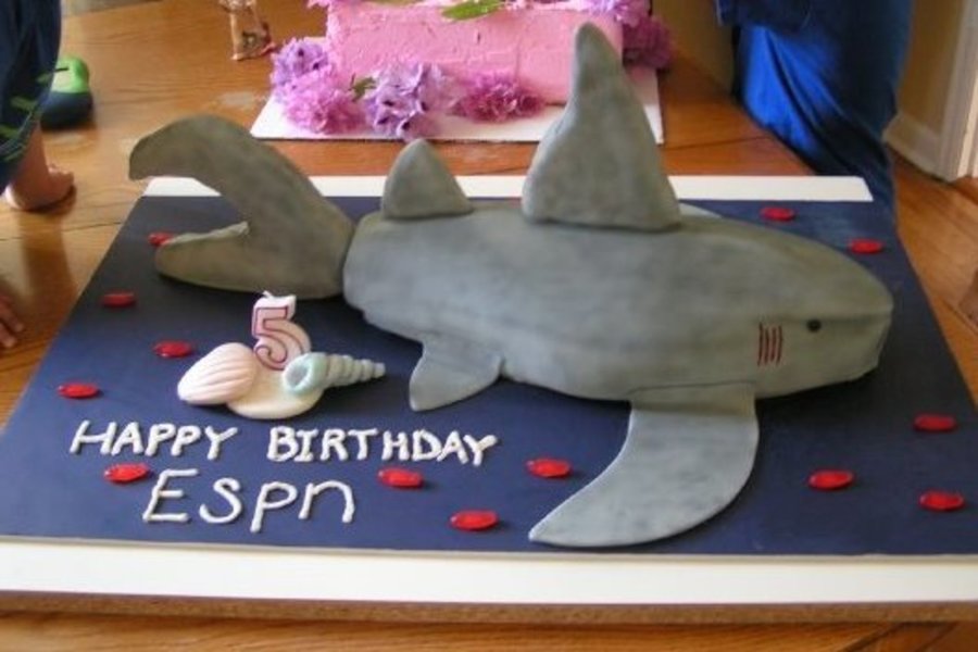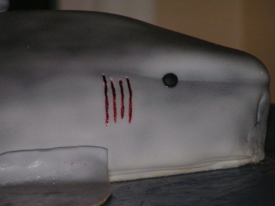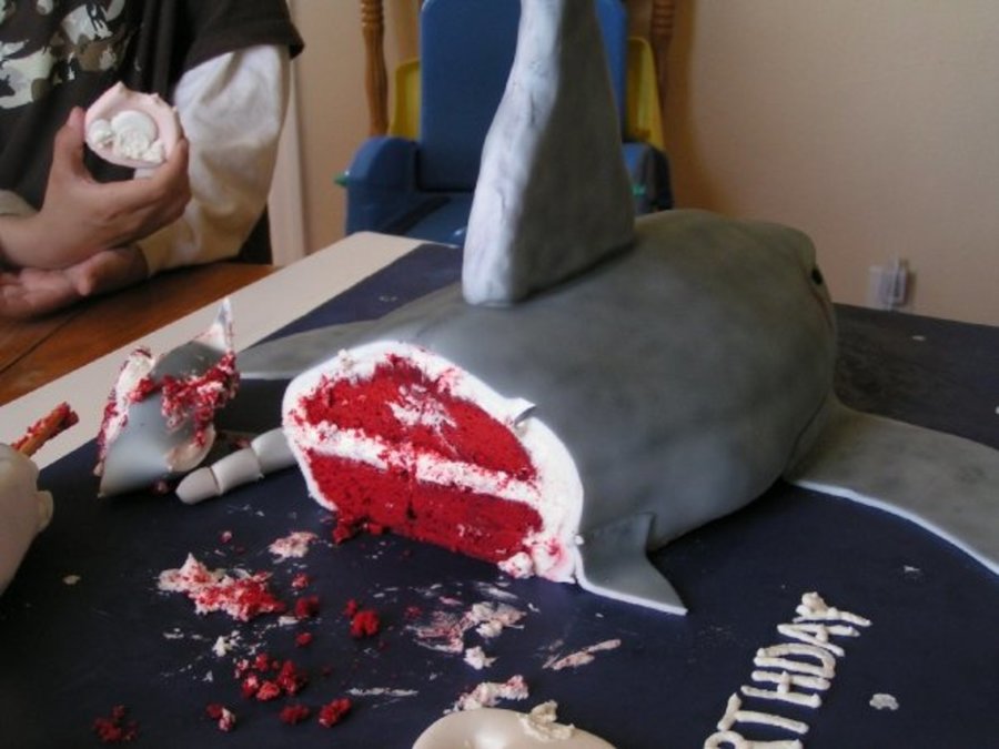 This was a really fun cakd to make for my son's birthday. I made it in 2009. I shaped the whole cake and covered it with fondant. The side fins are made from fondant and the top and back are made using rice crispies and covering with fondant. They are pretty sorry looking because it was my first time sculpting and covering rice crispies. I had the hardest time getting them to stay on without tipping. I then airbrushed the whole cake with shades of gray. That too was a new experience. My favorite part of the cake would have to be the inside. RED VELVET gave the perfect look for the shark meat. My son loved this cake. However, he did get a surprise with the pink cake in the background. I told him that if he didn't start behaving he would get a princess pink cake for his birthday and that is the fist cake he saw (it was just a frosted box). He was pretty upset until he saw the real cake.