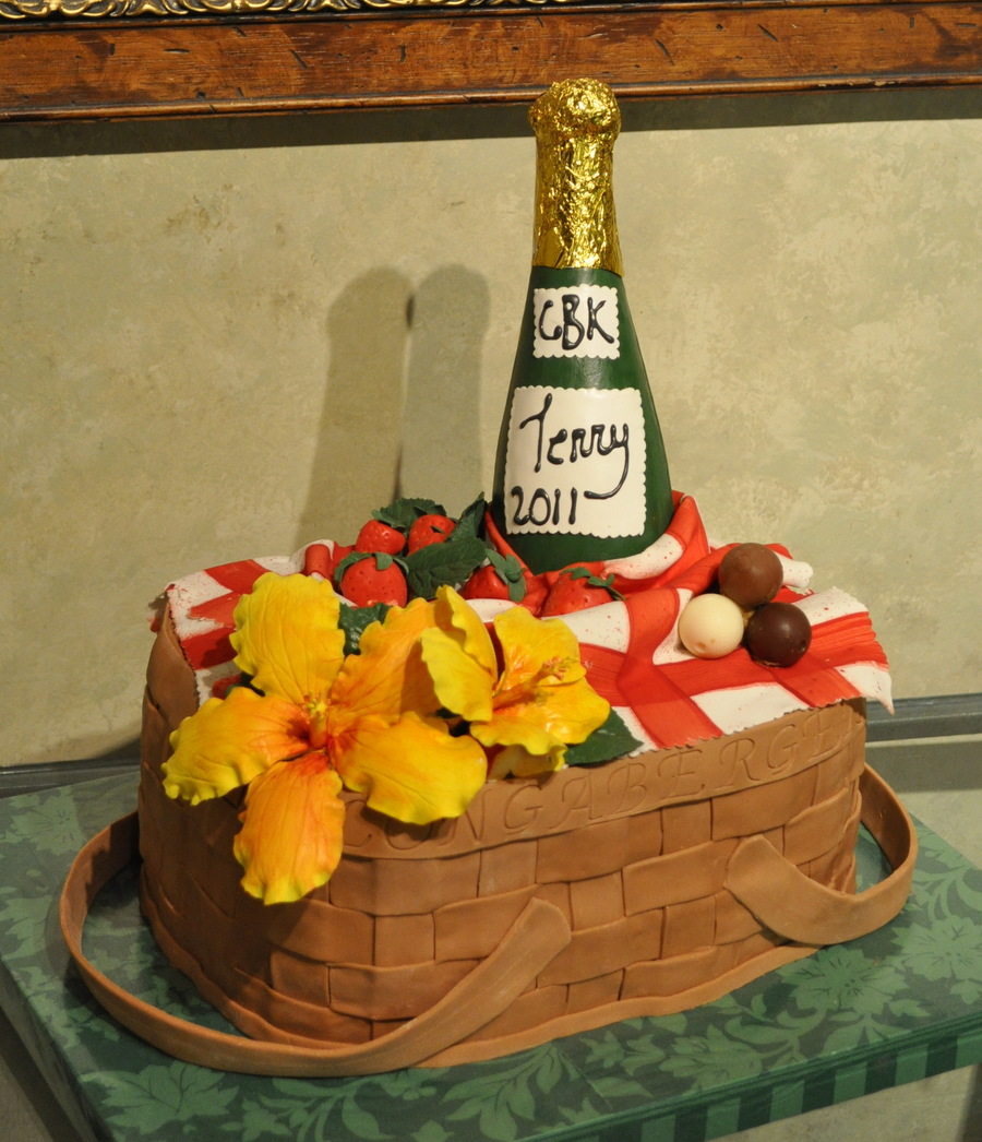 Fondant basket weave, gumpaste tablecloth, hibicus, strawberries and champagne bottle