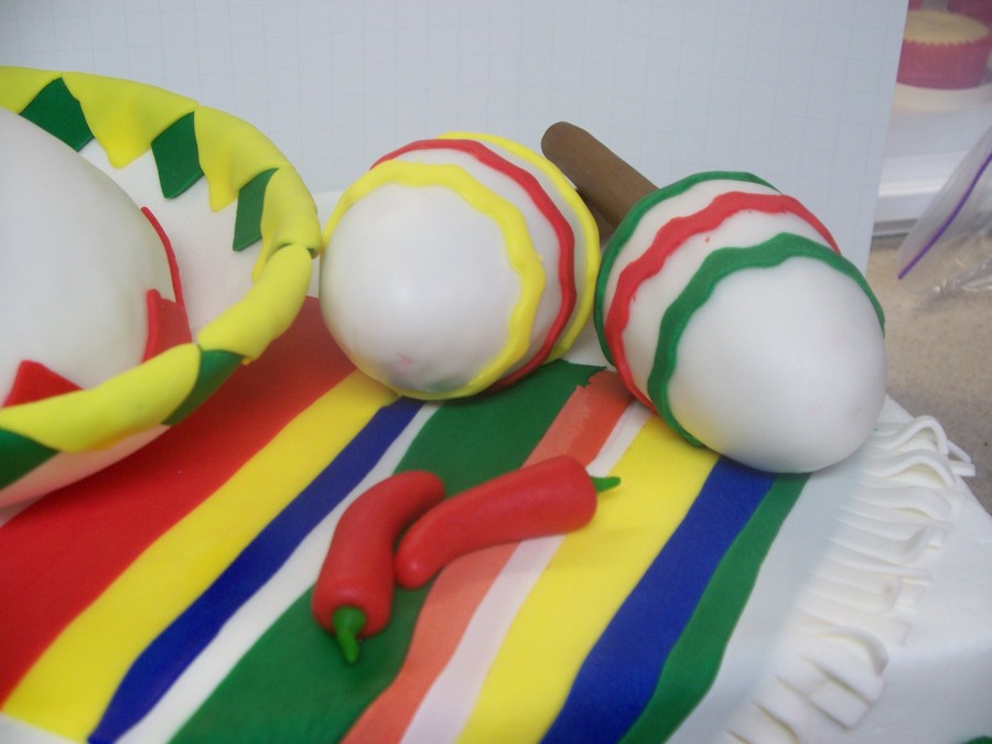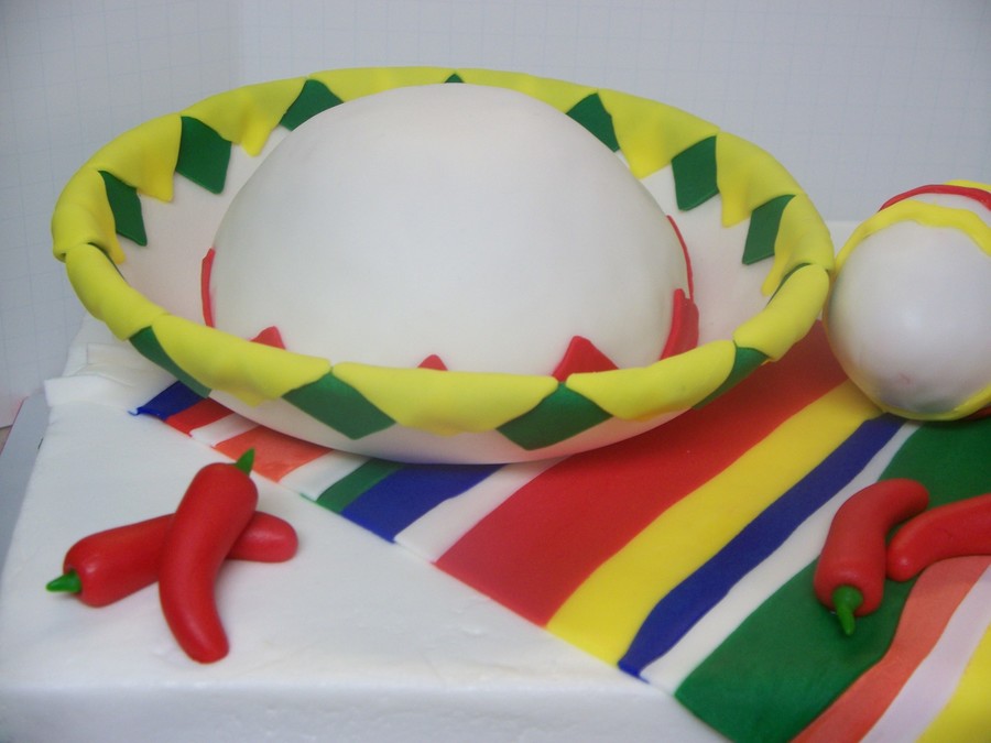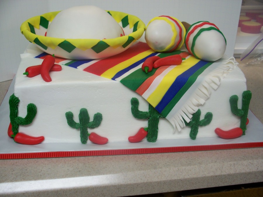 My 15 year old granddaughter and I made this cake for her Spanish class. Cake is iced in buttercream with fondant decorations. Hat and maracas are made of RKT. She molded and decorated the hat and maracas and made all the chilis. I think she did a great job.