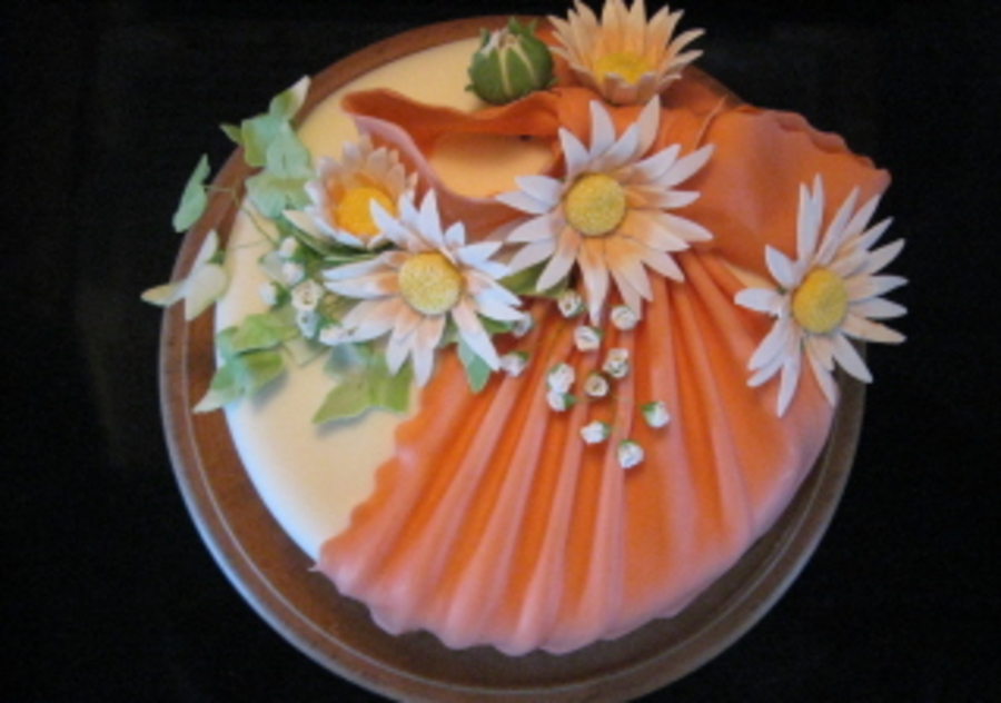 A lemon cake covered in fondant. The drape and bow are fondant, the flowers and ivy are gumpaste.