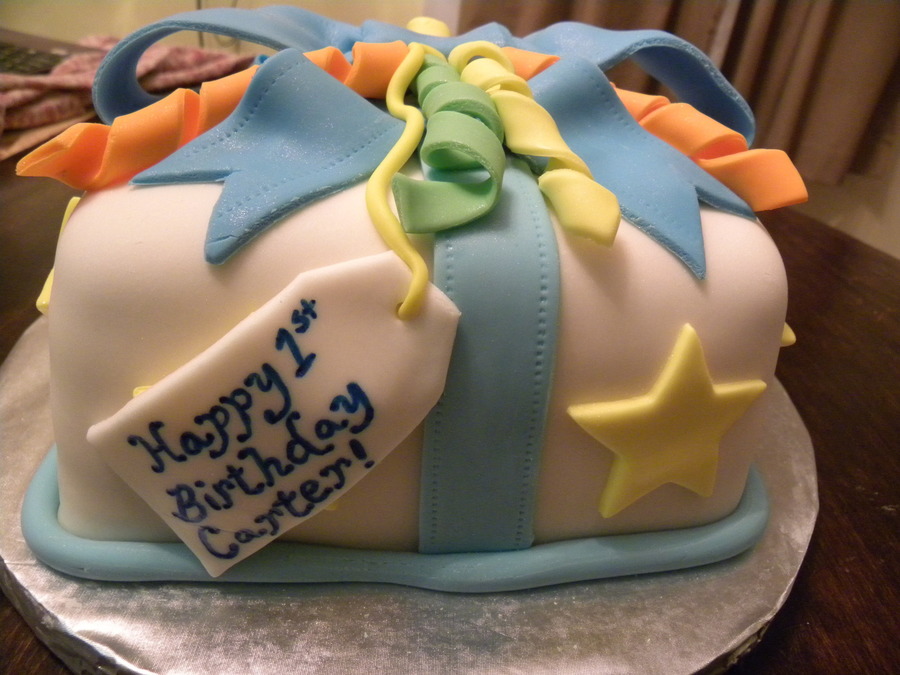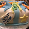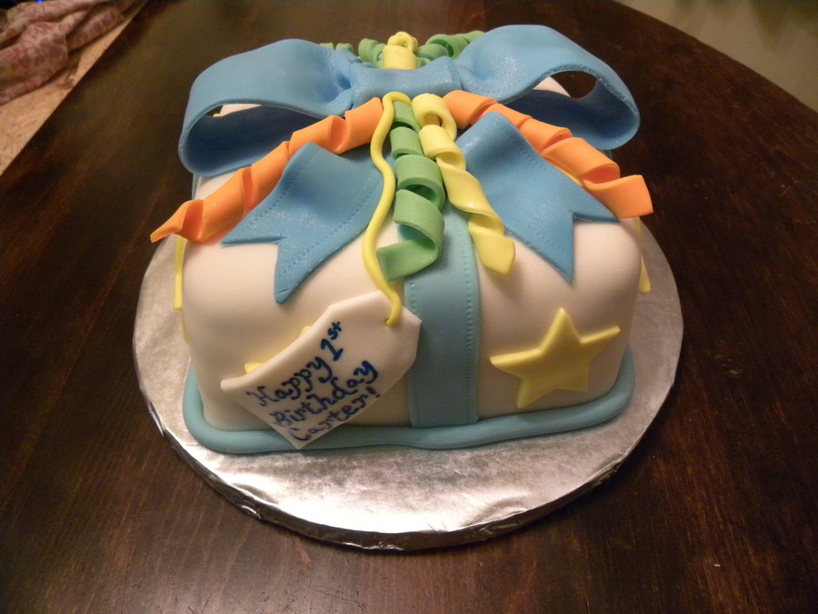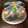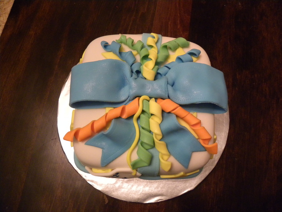 Chocolate and vanilla marbled cake with buttercream and MMF. Bow and decoration made from fondant.
