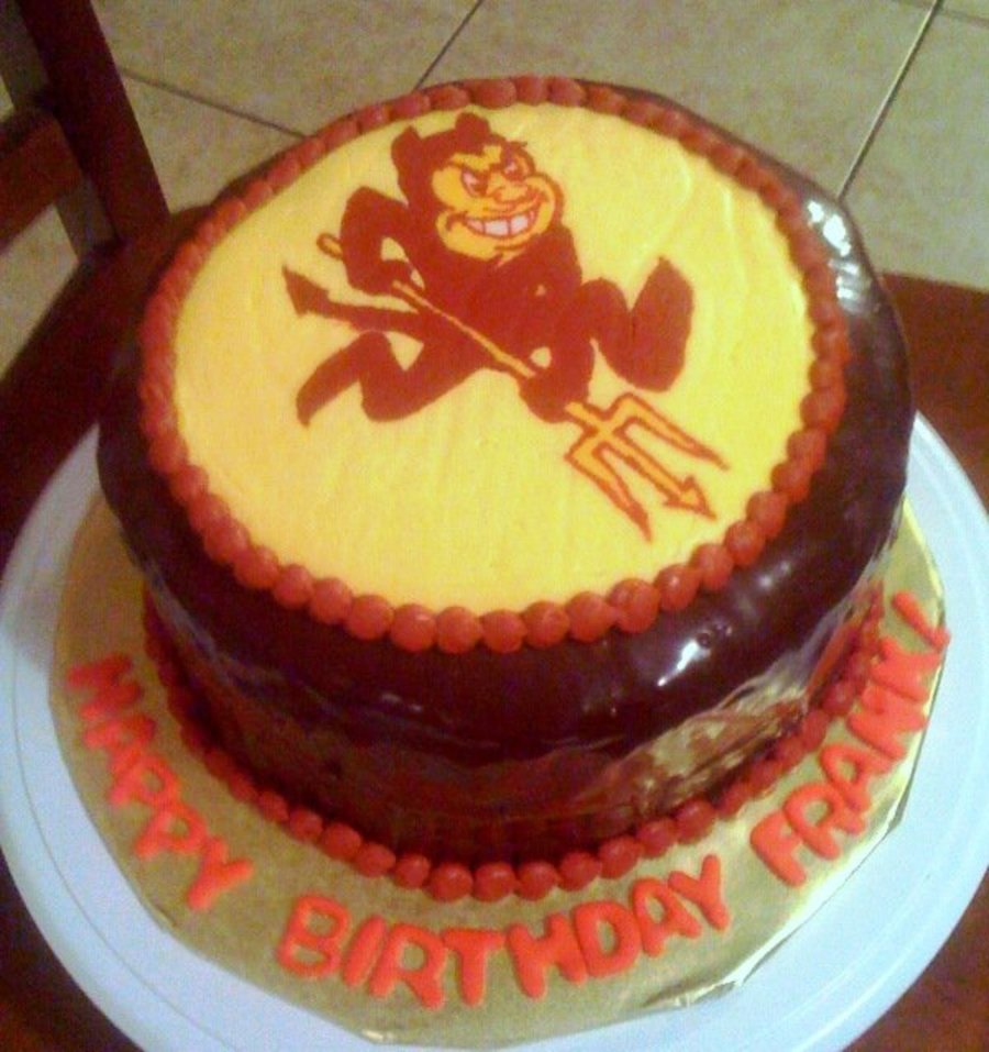 cake for my boss who is a Sun Devil alumni- hope he didnt take offense to the devil motif LOL...chocolate cake w/ choco caramel mousse filling. Topped w/ chocolate buttercream & chocolate ganache.