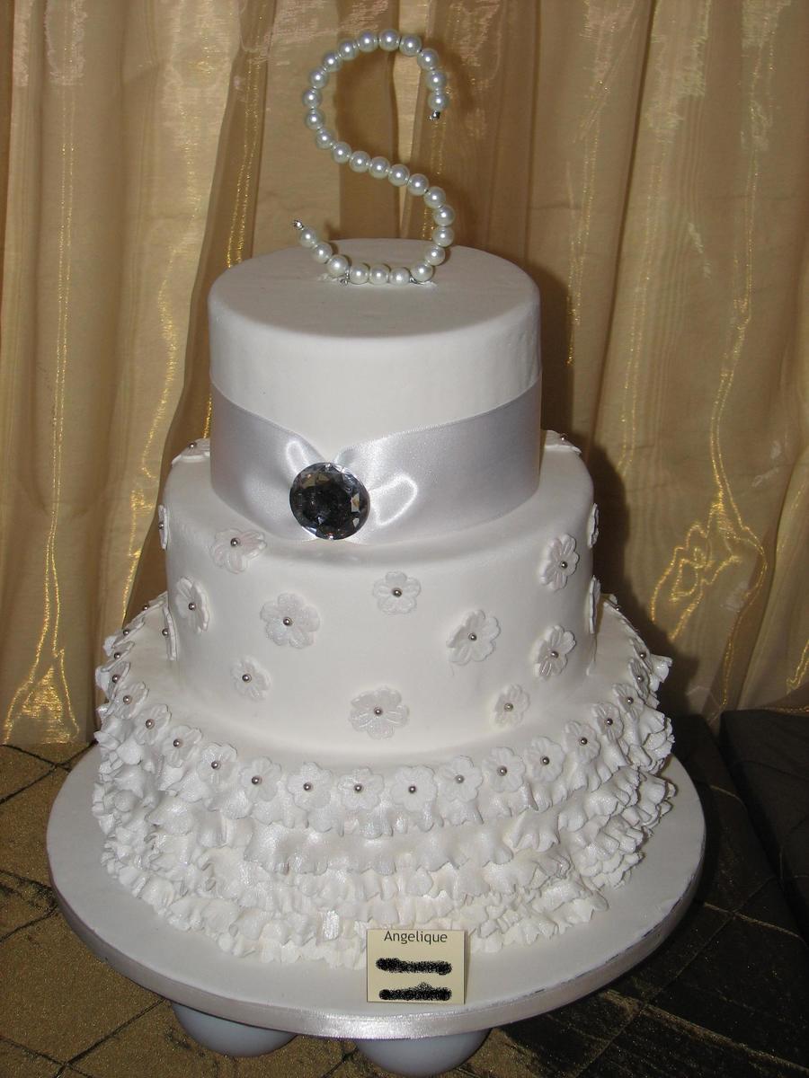 A cake I did for a bridal show I recently attended. Its a 5.8.11. Everything is fondant/gumpate except the monogram, that I made from pearl beads and some wire.