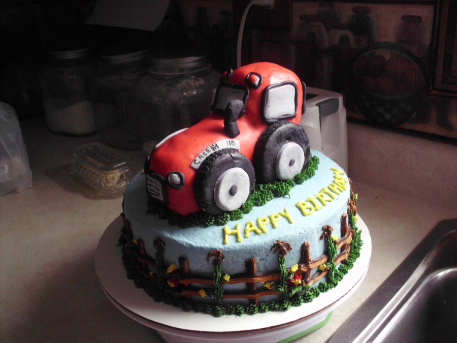This is my first attempt at making a tractor. The cake is covered and decorated in buttercream. The tractor is rice cereal treats, covered in mmf. Not bad for a first try.