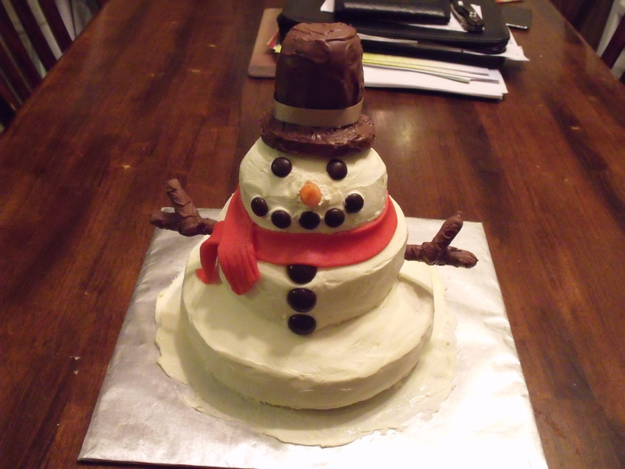3 tier snowman, carrot cake. Real carrot nose. RKT hat dipped in almond bark. arms are pretzel rods broken into shape and dipped in almond bark
