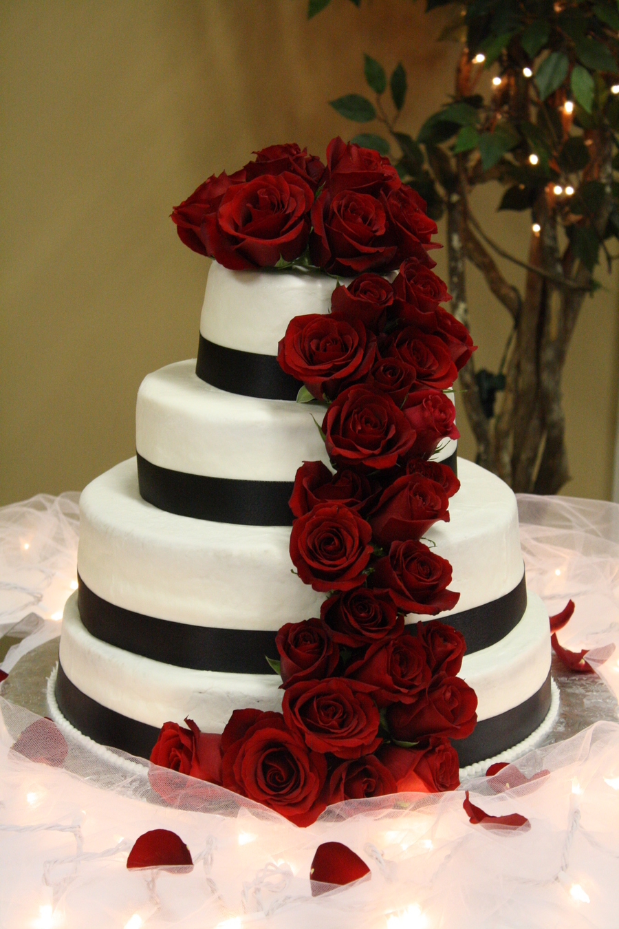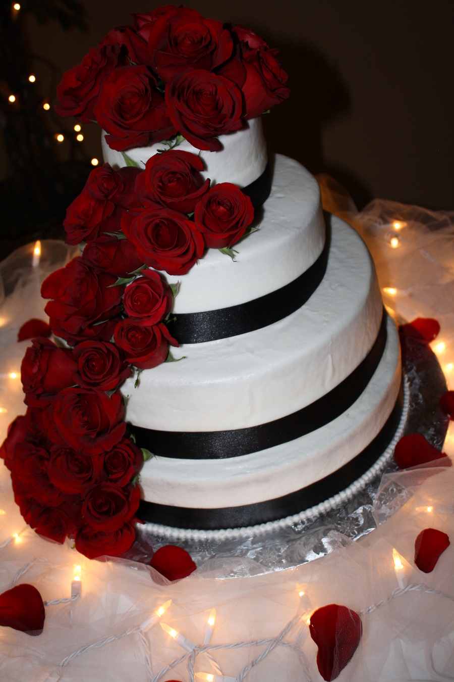 This was the cake I made for my daughters wedding. Two layers were chocolate for the bride and 2 layers were yellow for the groom. It was filled with buttercream and covered with buttercream. The black band is a satin ribbon and real red roses.