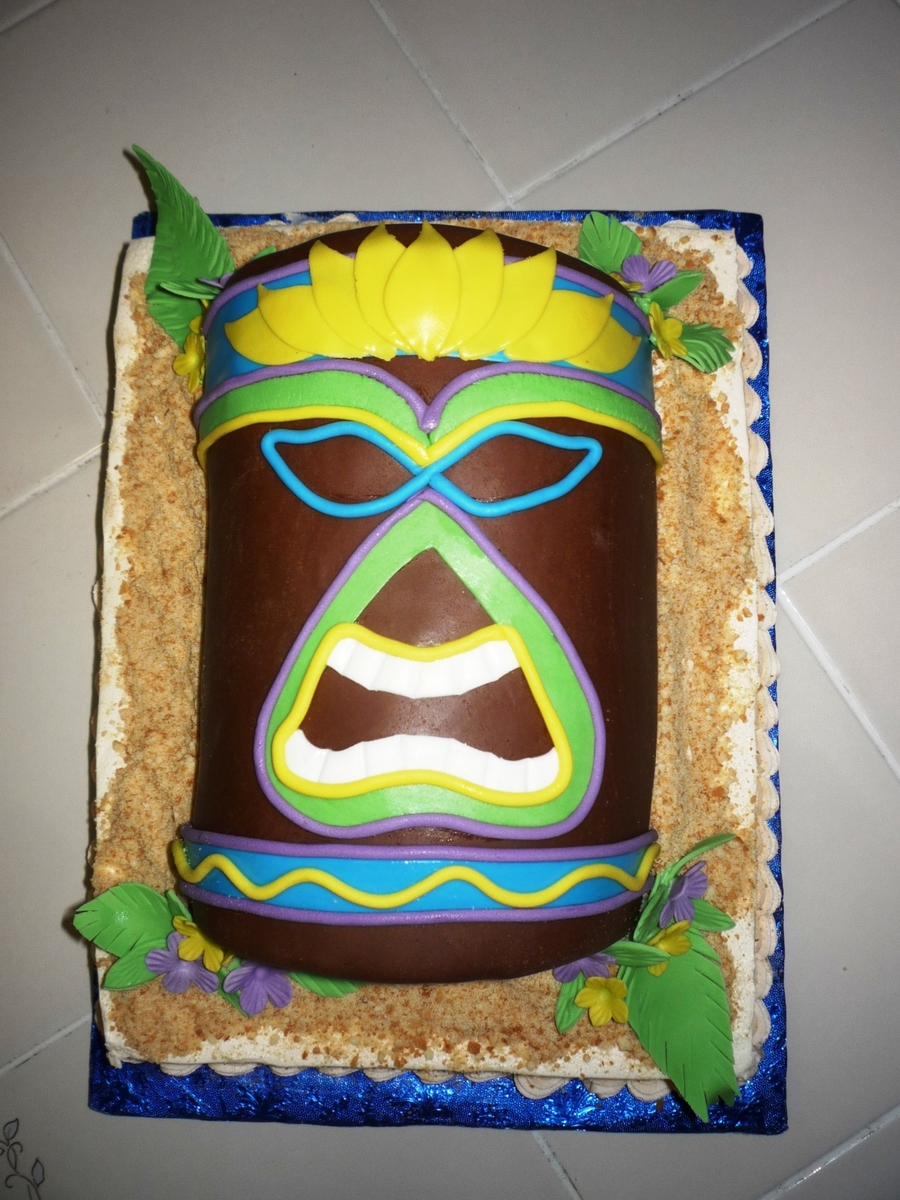This cake is for my 3YO's birthday party which is a mid-winter luau. 1/4 sheet cake stacked with a reclining Tiki made from 6in cakes cut in half and lined up lengthwise. The tiki is vanilla WASC cake w/chocolate BC covered in chocolate fondant w/fondant decorations. The base cake is chocolate WASC with cookies & cream filling. I would love to thank the original cake artist who inspired this but I don't know their name. TFL