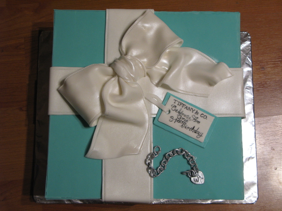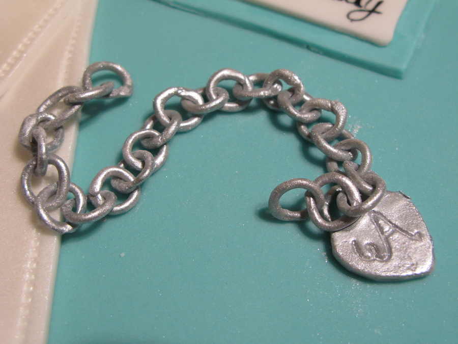 Pretty happy just not please about the lid. I should have put support in the middle of the cake under the lid because the weight of the ribbon and bow weighed down the cake and made a little crack in the front of the lid. Rest of cake covered in fondant and charm bracelet made from gumpaste (I don't think I'll ever make a charm bracelet again too time consuming!!)