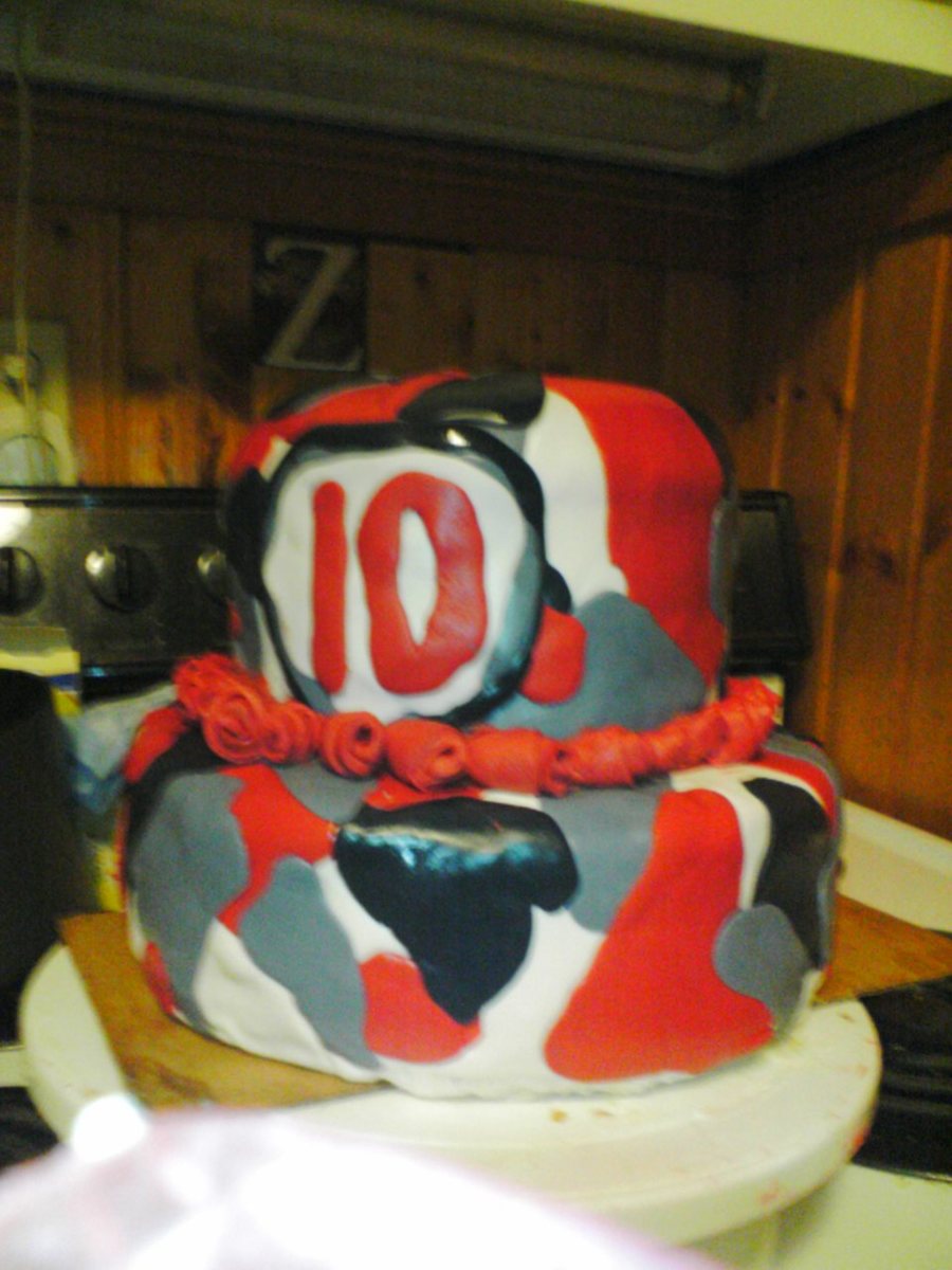 This is a cake that I was asked to make for a 10 year old girl. She wanted red, gray and black cammo, with red fondant roses.