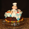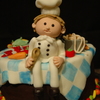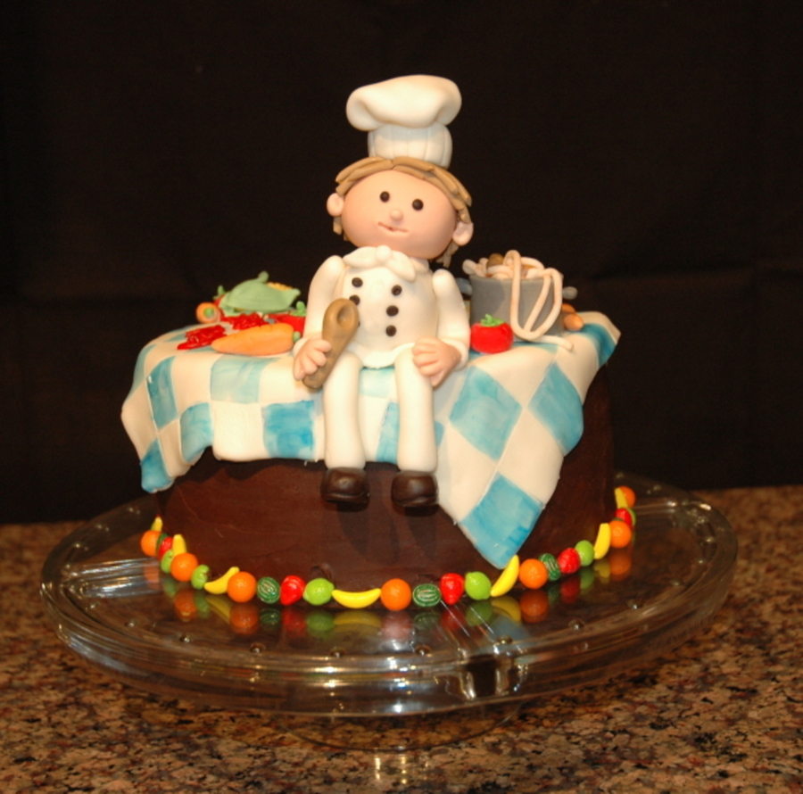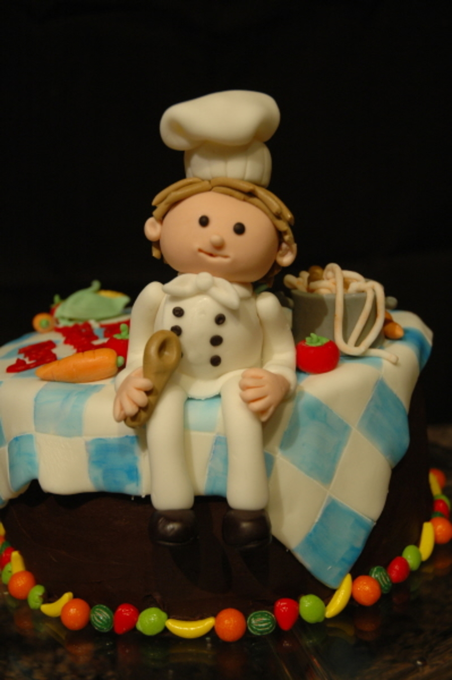Chocolate Cake covered in ganache. Tablecloth is fondant painted with gel color. Chef and food on top of cake made with fondant and gumpaste. Fruit border is candy.