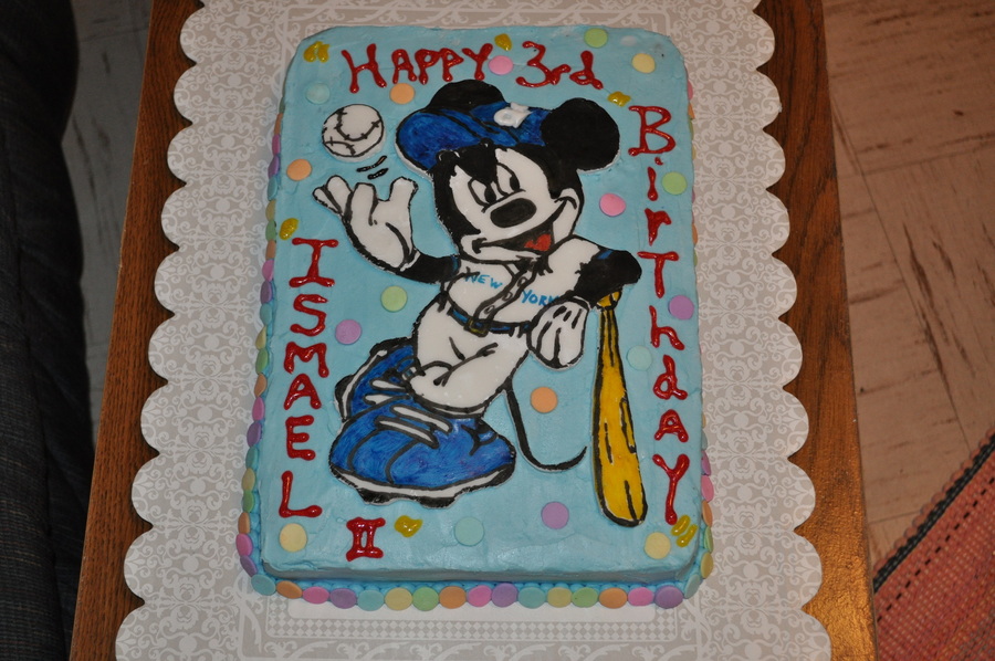 Made of fondant over layer of BC on Chocolate cake...Candy wafers on edge..Mickey made from Fondant..........Please comment if you like it, Thank You