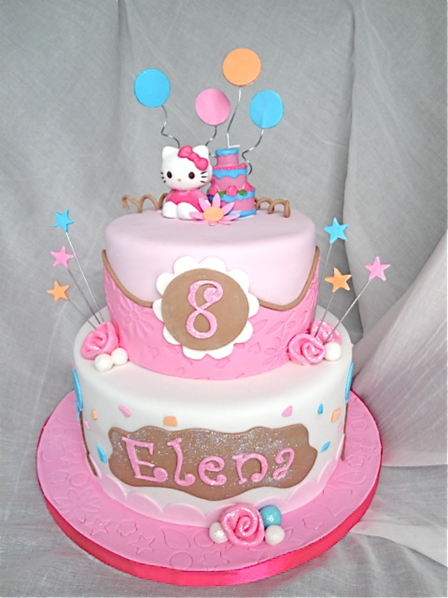 This is a 6" and 9" Devils Foodcake with chocolate pudding filling, covered in chocolate buttercream and covered with Fondx Fondant. All decorations are fondant with the exception of the Hello Kitty - which was a candle. Thanks for looking!!