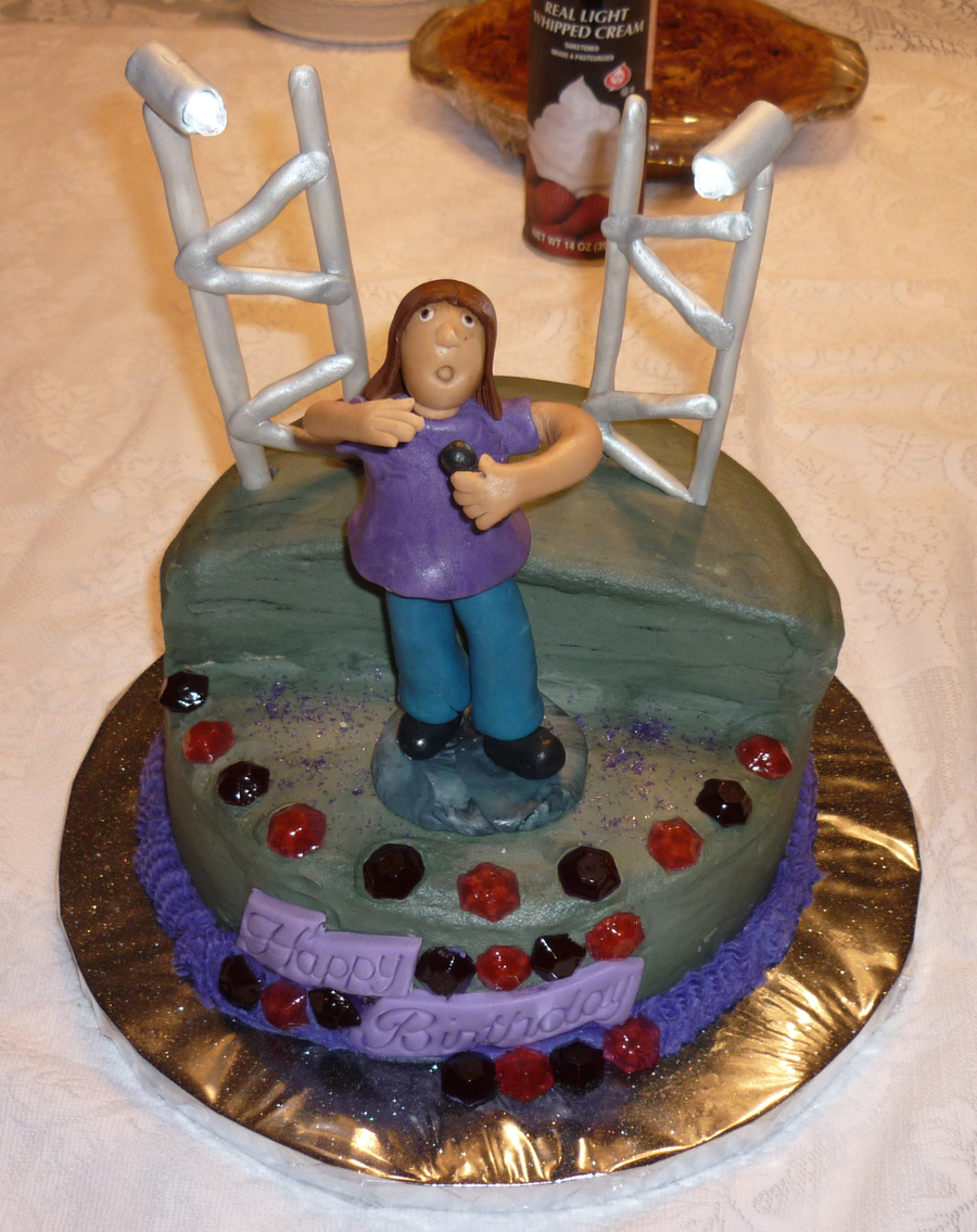 Fondant Happy Birthday and scaffolding holding real working lights. Figure is gum paste and gems are hard sugar candies.