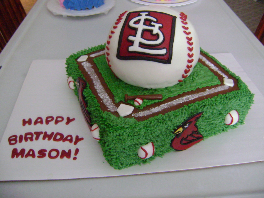 Choclate cake with buttercream grass, baseball covered in mmf and all other decorations are made of mmf. base lines are powdered sugar.