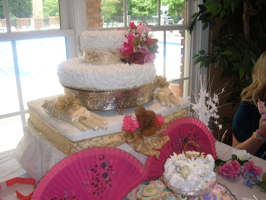 Hat cake for a Hat/Tea Party This cake is a butter cake with buttercream frosting I used 2 -9 inch cake pans and a 12 inch cake pan, I also used decorative gold ribbon around the hat with artificle flowers.
