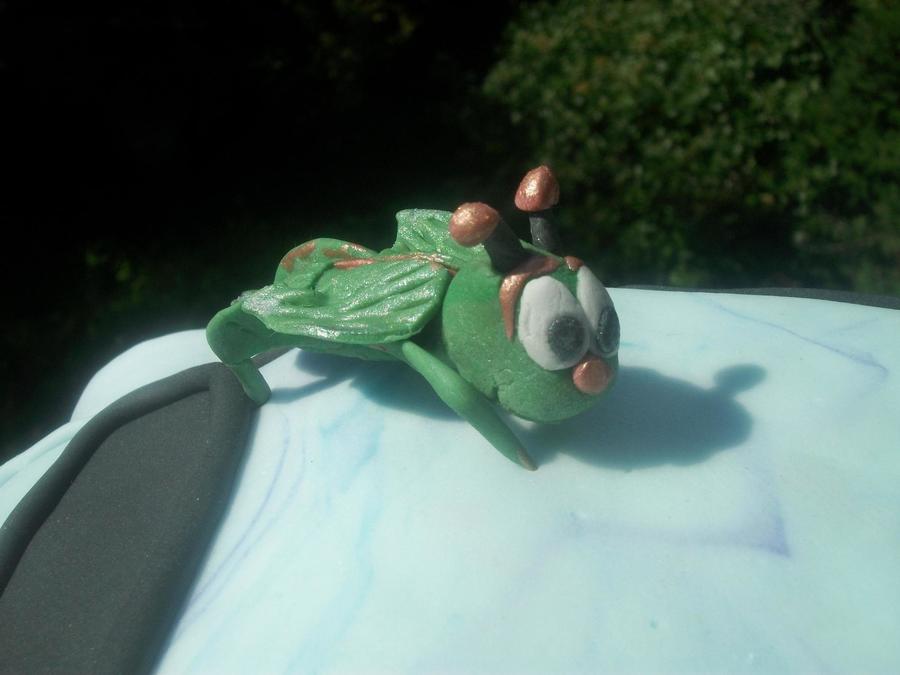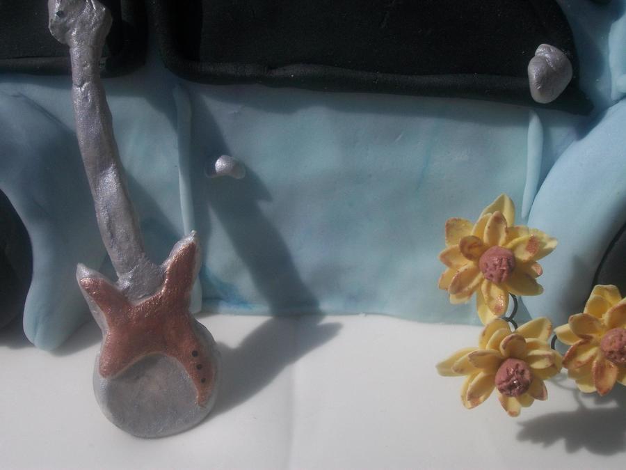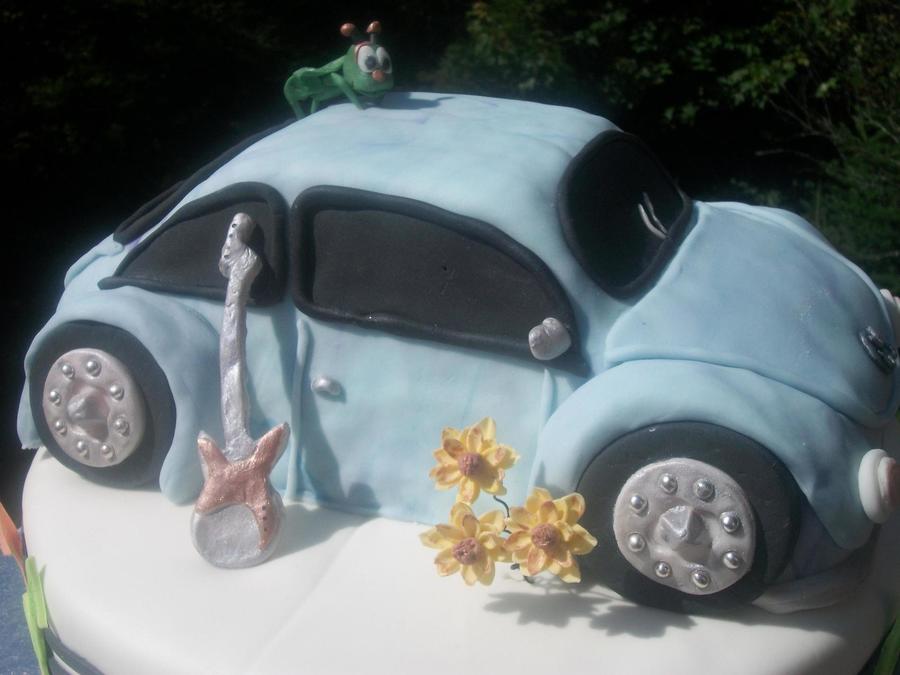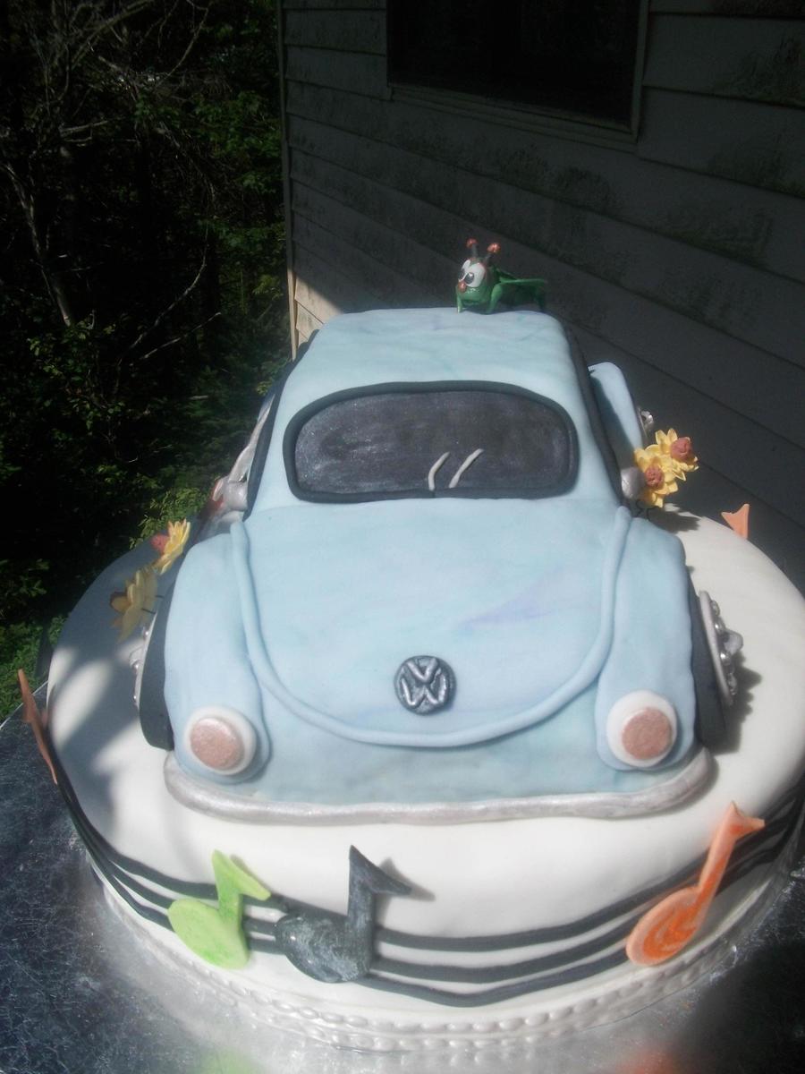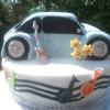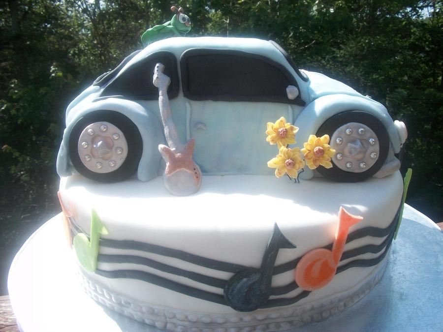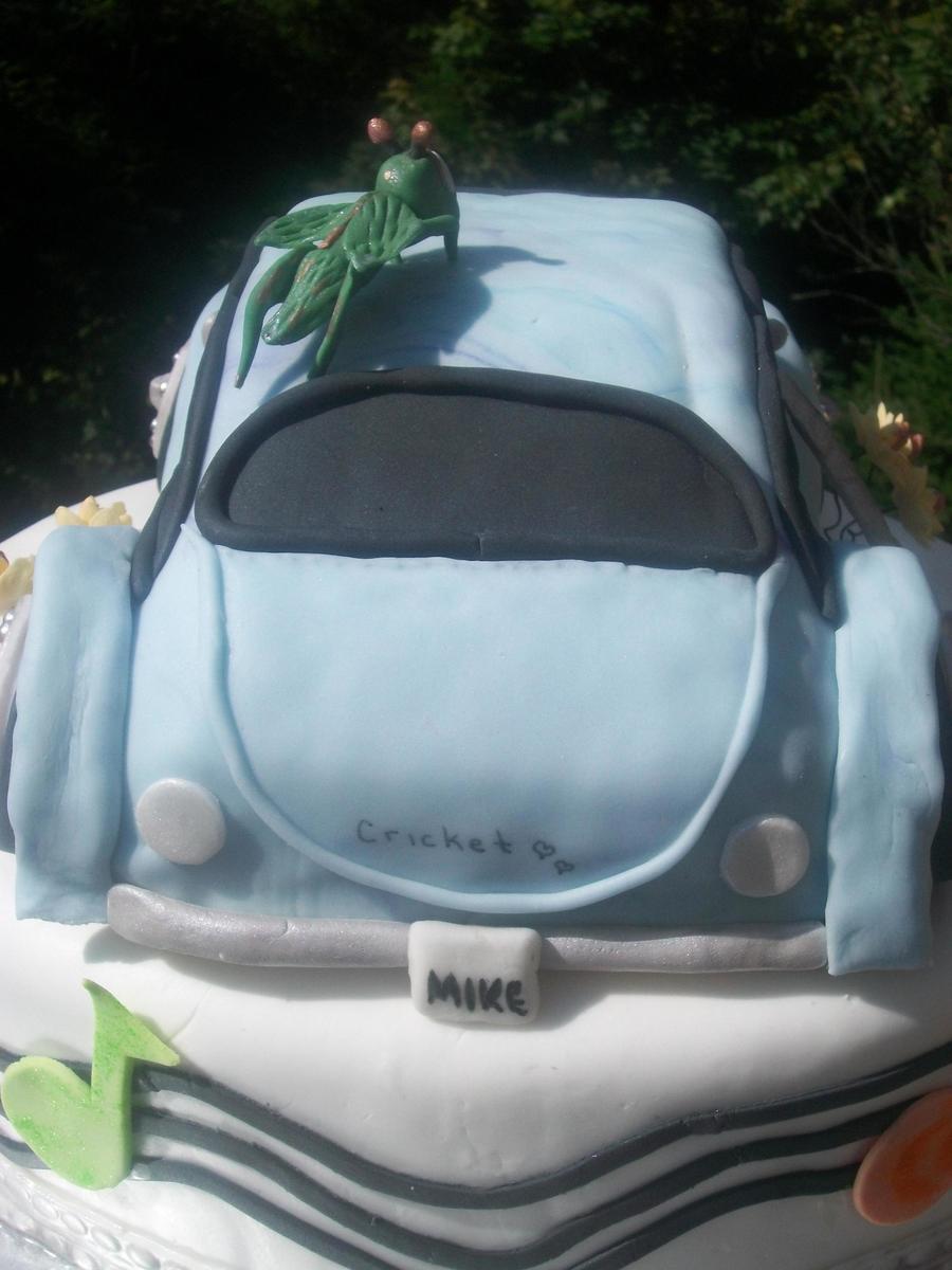 Birthday cake for Mike. This is his car, he calls it Cricket! He plays Bass guitar loves music,and loves to pick flowers from his dads garden. Cricket on top of car and music notes around cake. :) My first car.