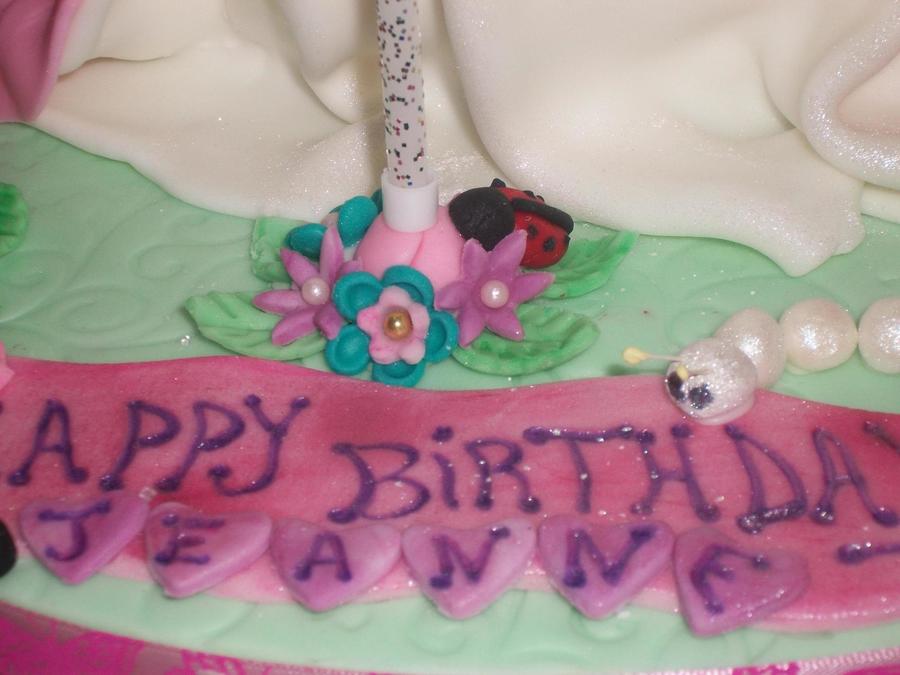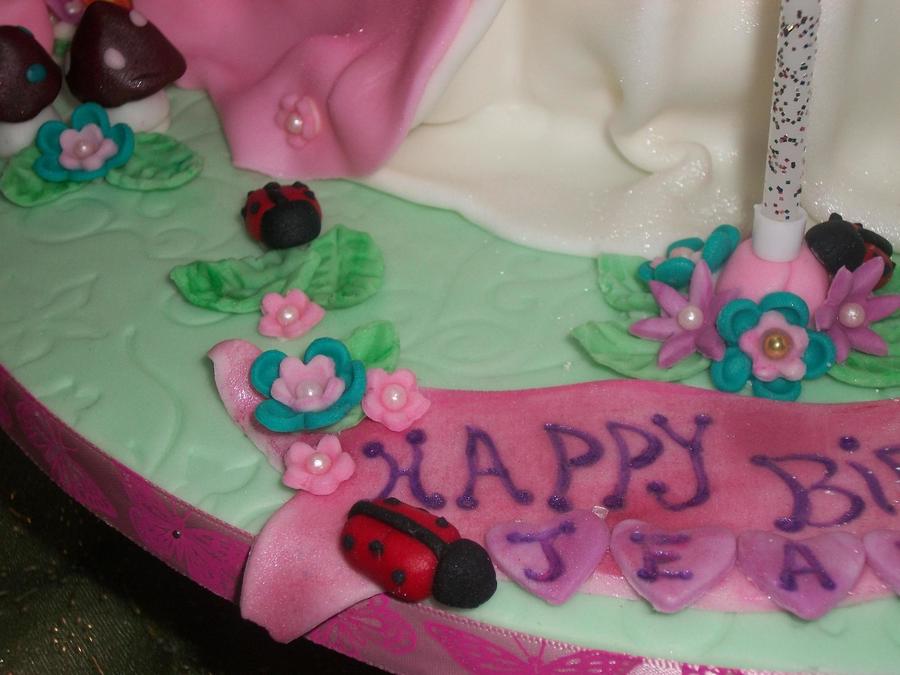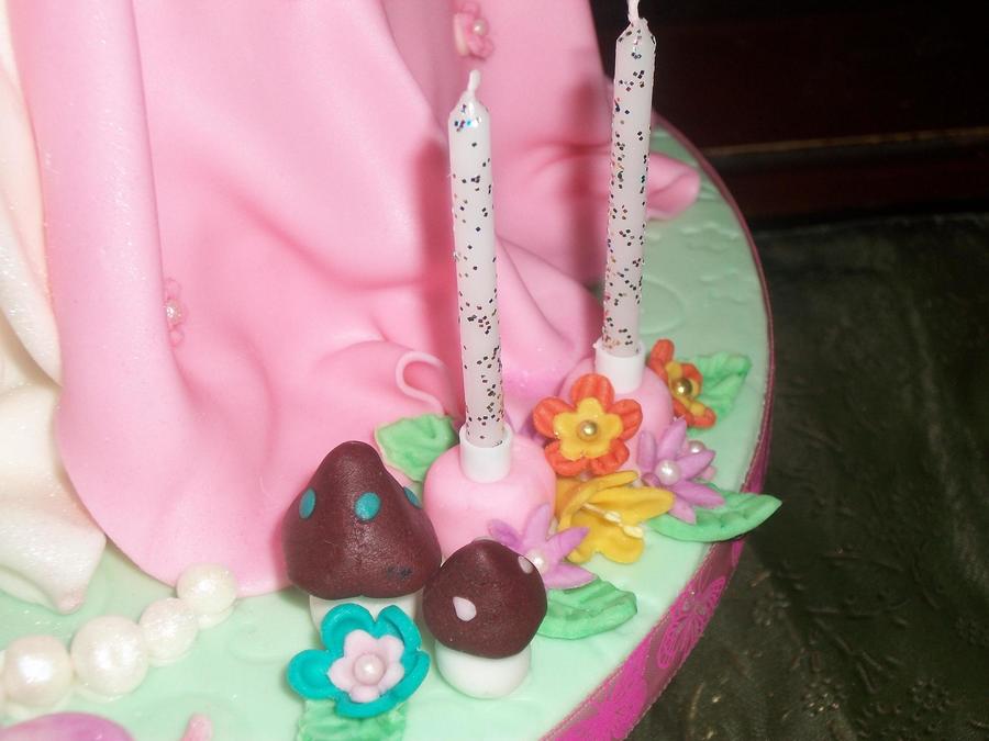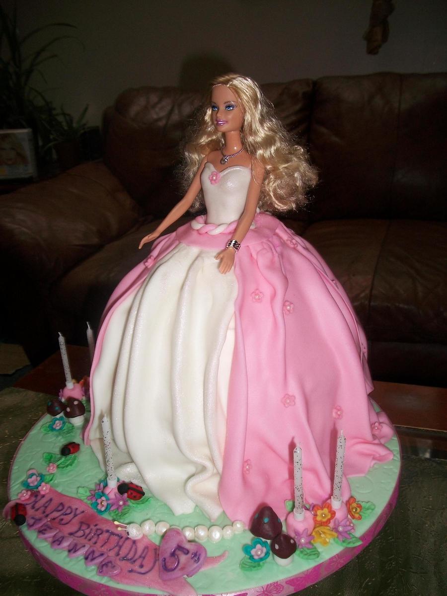 Barbie doll cake, with fondant flowers, mushrooms, lady bugs and centapede. The cake is named after the little girl it was made for and she loved it!