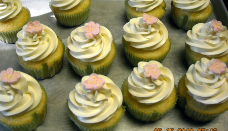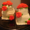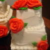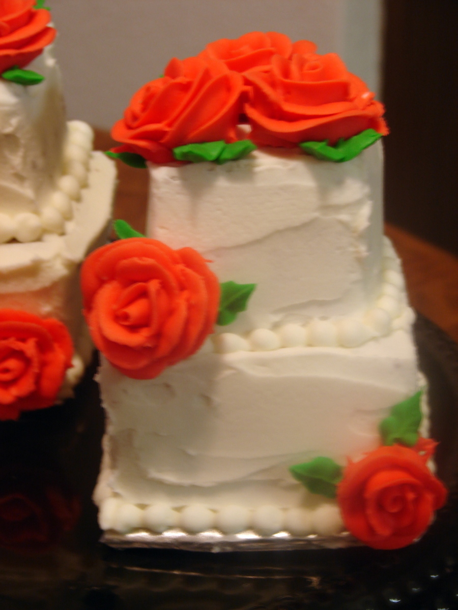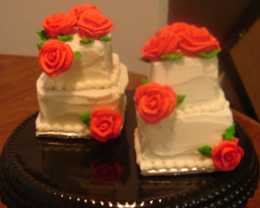 These are mini chocolate tiered cakes iced in vanilla buttercream and decorated with buttercream roses.
