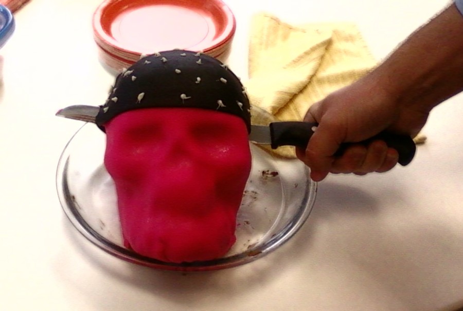 I used the Wilton 3D Skull cake pan, covered it in Duff fondant. I used a little of the pearl dust in the eyes, mouth an nose to give it a little shine.