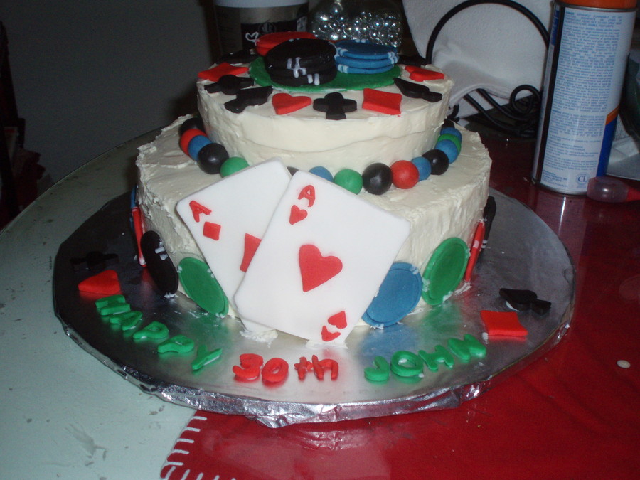 Poker themed birthday cake for my co-worker''s husband. Inspired by tinygoose's poker cake. Cake was red velvet with cream cheese icing and fondant.