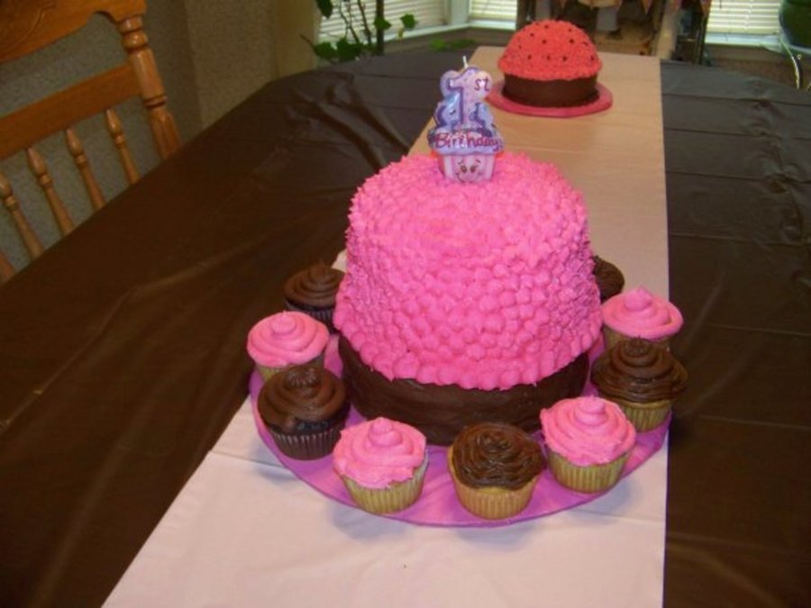 I used a Pampered Chef Batter bowl for the top part of the cupcake and 8 inch round pans for the bottom. I trimmed the top so that it wasn't so pointy.