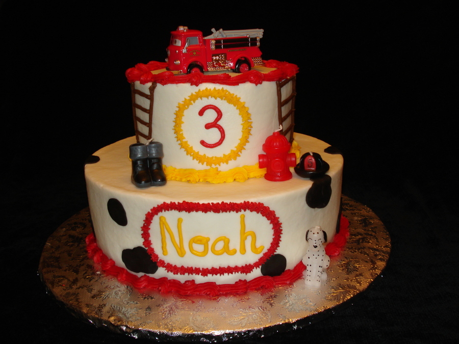 Colorful fire station themed cake. Buttercream and fondant "spots" with candle accents + truck on top. The little boy loved it! Thanks to several on CC for inspiration!